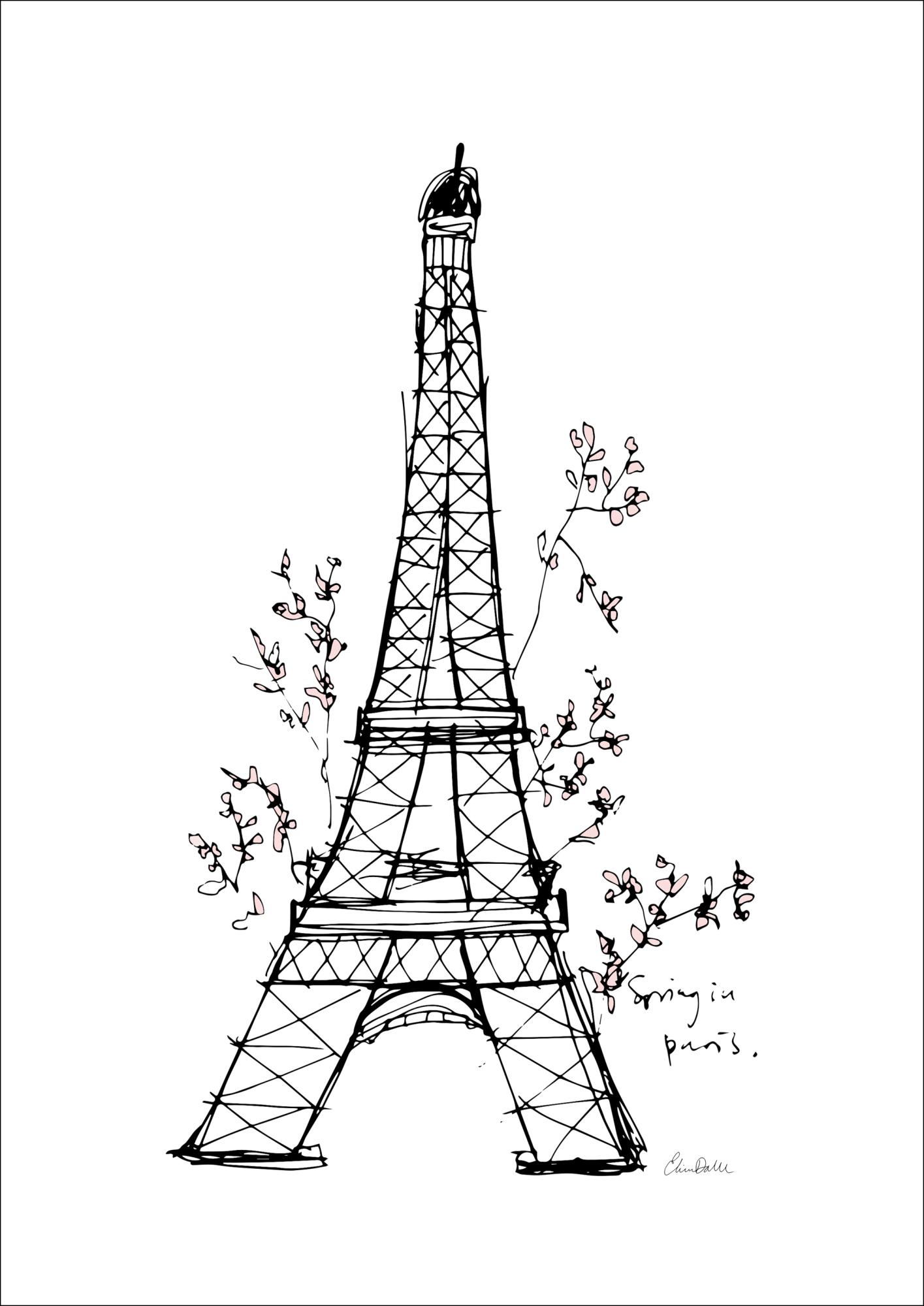 Ein Poster mit einer einfachen Tuschezeichnung des Eiffelturms als Wahrzeichen. Die kratzenden Linien dieses Bildes und die Schräglage des Turms tragen dazu bei, dass dieses Bild eine illustrative Qualität hat. Große blühende Zweige, die sich hinter dem Turm auffächern, sorgen für eine frühlingshafte Stimmung in Paris.