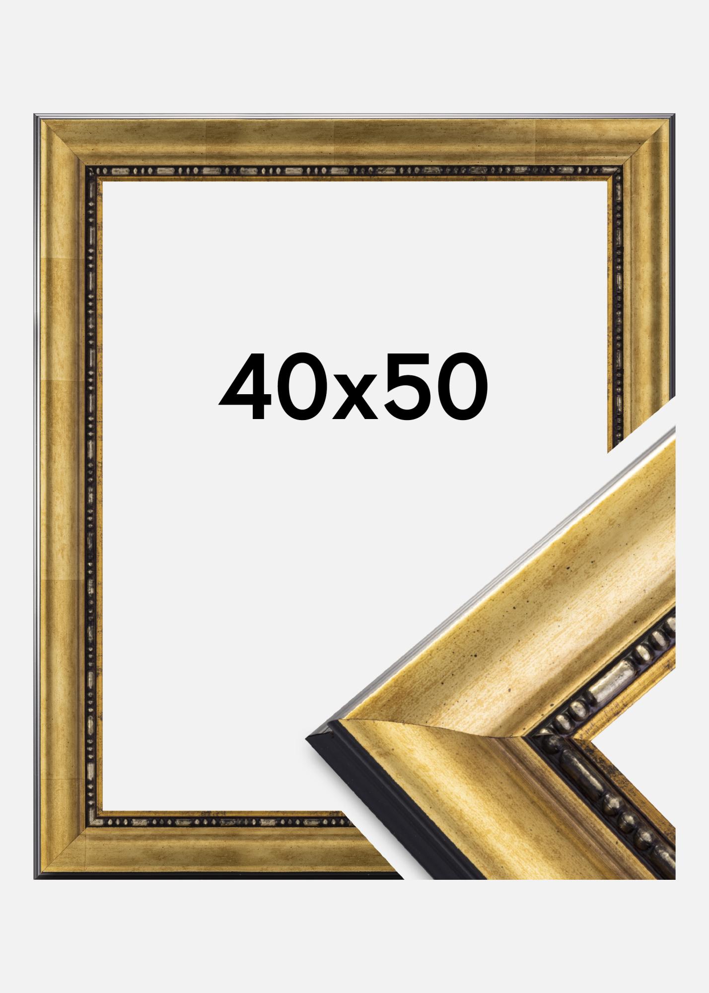Klassischer Porträtrahmen für Fotos, die du besonders gerne magst. Der Bilderrahmen hat schwarze Seiten mit einer profilierten Goldfarbe auf der Vorderseite sowie Dekorationen an der Innenkante.