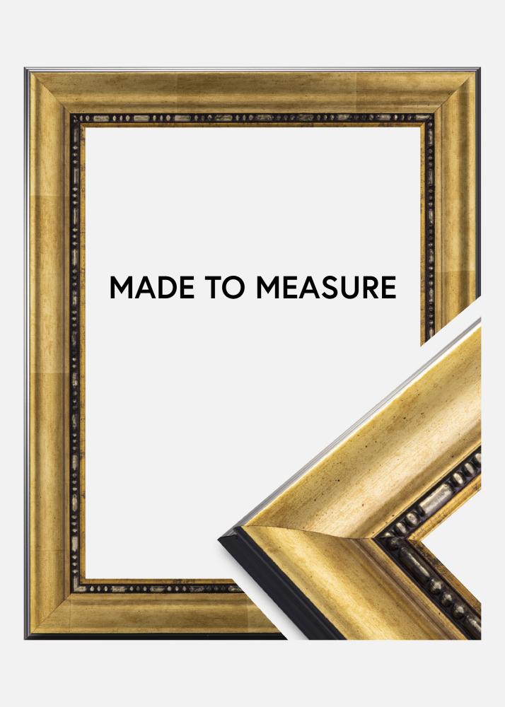 Klassischer Porträtrahmen für Fotos, die du besonders gerne magst. Der Bilderrahmen hat schwarze Seiten mit einer profilierten Goldfarbe auf der Vorderseite sowie Dekorationen an der Innenkante.