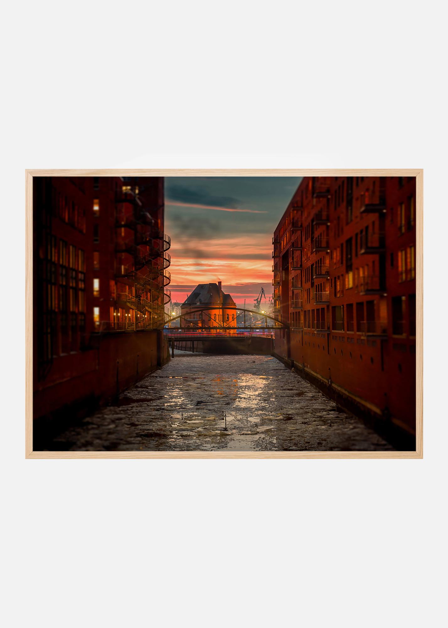 Sonnenuntergang über dem alten Lagerhausviertel Speicherstadt in Hamburg mit seinen Kanälen und neugotischen Backsteingebäuden. Die Fotografie aus dem denkmalgeschützten Bereich passt gut in das Zuhause eines Architektur- oder Geschichtsinteressierten. Das Poster macht sich am besten in einem dünnen Metallrahmen, der zur strengen Architektur passt und sieht an der Wand zusammen mit anderen Stadtbildern schick aus.