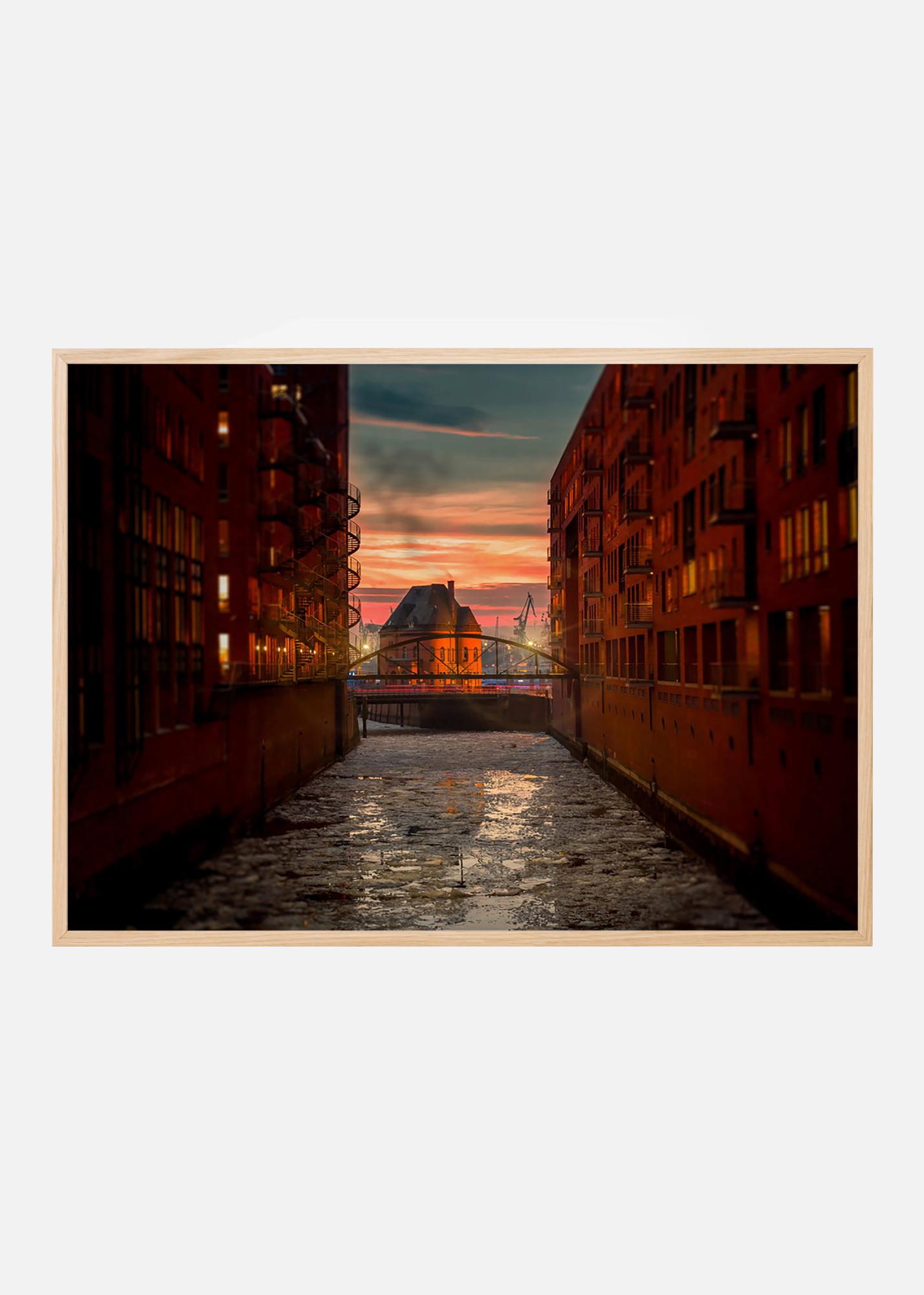Sonnenuntergang über dem alten Lagerhausviertel Speicherstadt in Hamburg mit seinen Kanälen und neugotischen Backsteingebäuden. Das Fotografie aus dem denkmalgeschützten Bereich passt gut in das Zuhause eines Architektur- oder Geschichtsinteressierten. Das Poster kommt am besten in einem dünnen Metallrahmen zur Geltung, der zur strengen Architektur passt und sieht an der Wand zusammen mit anderen Stadtbildern schick aus.