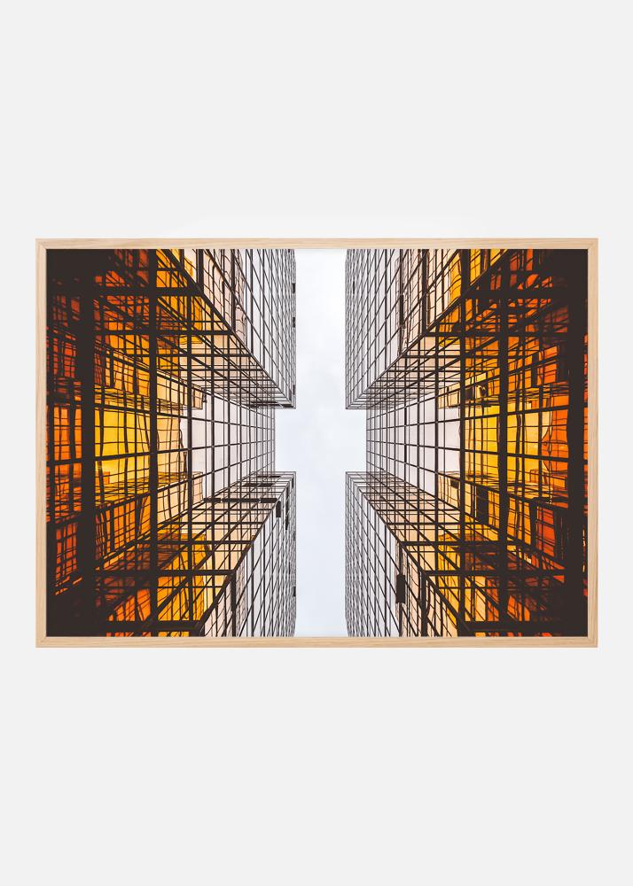 Poster mit futuristischer Architektur, die mit ihren grafischen Linien ein spannendes Muster erzeugt. Die Farben verlaufen von tiefem Orange am Gebäudesockel bis zum weißen Himmel. Das Poster passt gut in einen dünneren Rahmen, sowohl in minimalistischer Einrichtung als auch in anderen Stilen mit grafischen Elementen. Kombinieren Sie es gerne mit anderen Bildern von spannender Architektur oder Stadtszenen.