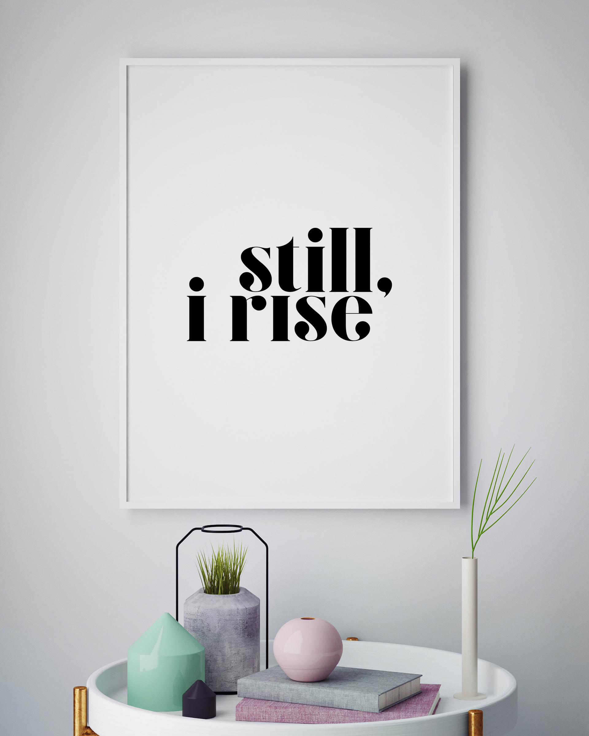Ein Inspirationsposter mit einem Spruch für jeden Tag in kräftigen schwarzen Buchstaben vor einem schlichten weißen Hintergrund. Geben Sie sich mit dem Satz Still, I Rise die Kraft, weiterzumachen, während Sie morgens Ihren Kaffee trinken und Ihren Tag planen.