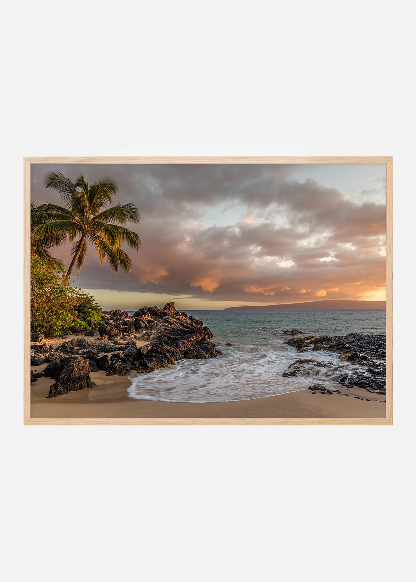 Ein Strand bei Sonnenuntergang, ein schöner Klischee, der ein Muss für den Tiki-Enthusiasten oder das tropische Thema ist. Poster mit der klassischen Palme, die sich über den Rand des Strandes in den letzten goldenen Sonnenstrahlen des Tages neigt. Das Fotografie sieht toll in einem Bilderrahmen mit einem verwitterten Aussehen oder in einer kräftigen Farbe aus, um zur Tiki-Einrichtung zu passen.