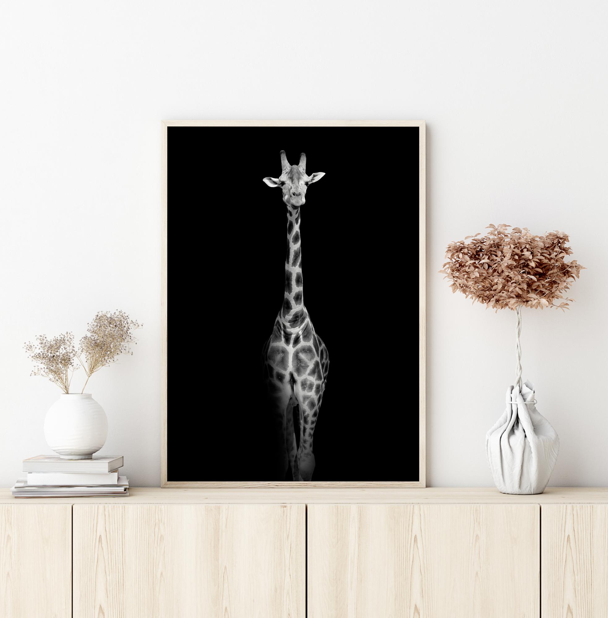 Fotografische Kunst in Schwarz-Weiß von einer schlanken Giraffe, die aus dem schwarzen Hintergrund des Bildes heraustritt. Ein stilvolles und kontrastreiches Poster mit einer wunderbaren Tiefe. Kombinieren Sie es gerne mit anderen unserer schönen Tierposter im gleichen Stil für eine Bildwand im gleichen Thema.