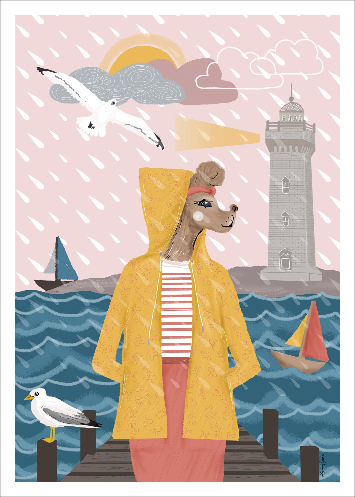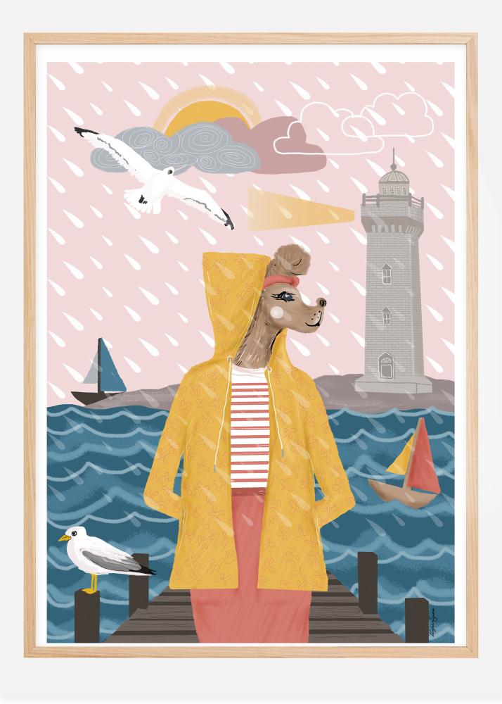 Ein Poster im Ausschnitt-Stil mit einem niedlichen Pudel in einem gelben Regenmantel, der im Regen steht. Er steht auf einem Pier vor niedlichen, blauen Wellen. Dahinter befindet sich ein Leuchtturm, zwei Boote schwimmen vorbei und eine Möwe fliegt über dem Wasser. Die Sonne lugt gerade durch die Wolken und ist bereit, alles in diesem lustigen Bild im Märchenbuch-Stil zu trocknen.