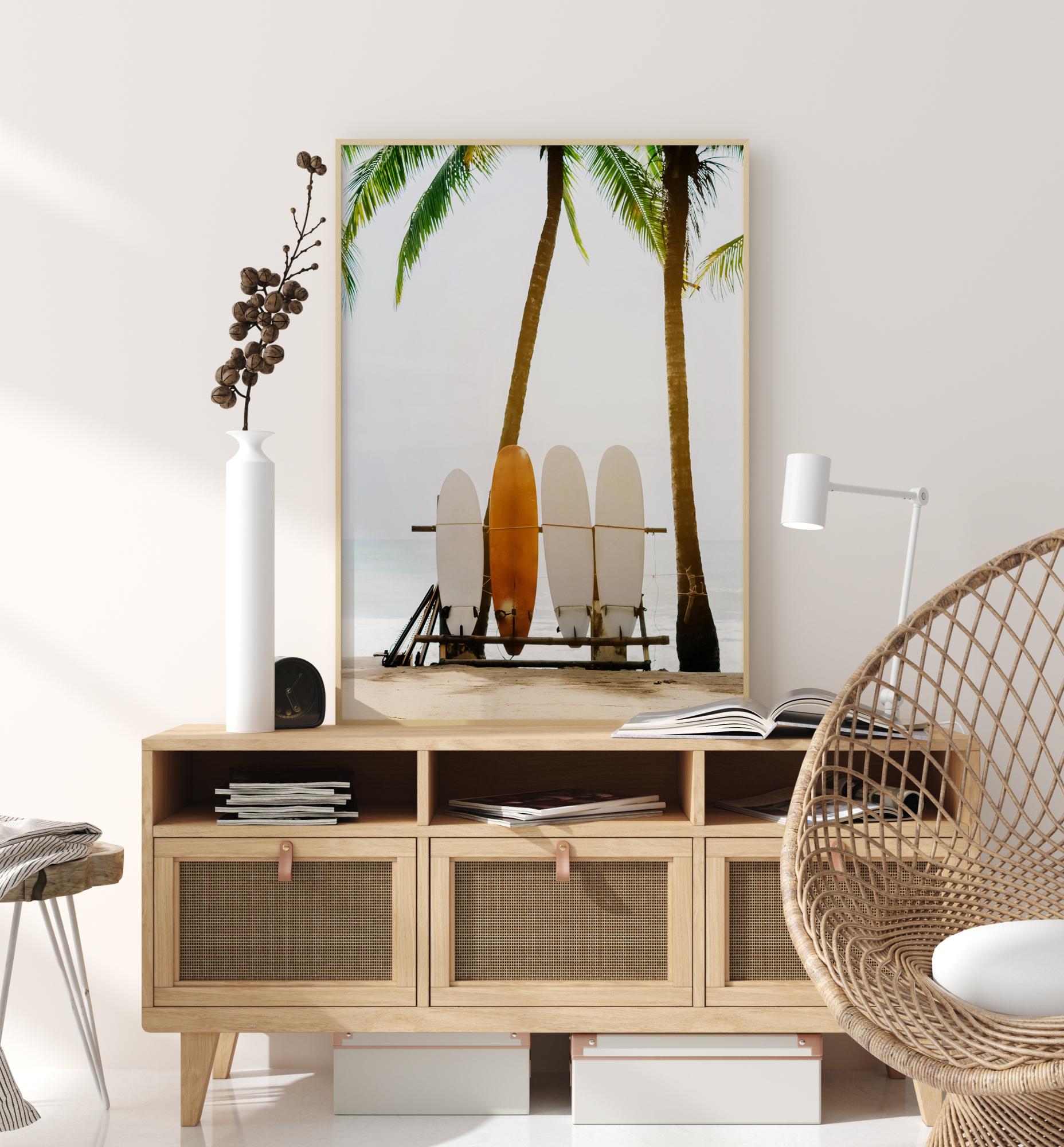 Ein sommerliches Feel-Good-Poster mit Surfboards, Palmen und weißem Sand. Ein herrlich exotisches Motiv in schönen Farben und schicken Kontrasten. Kombinieren Sie es gerne mit anderen unserer herrlichen Motive für eine größere, lebendigere Bilderwand.
