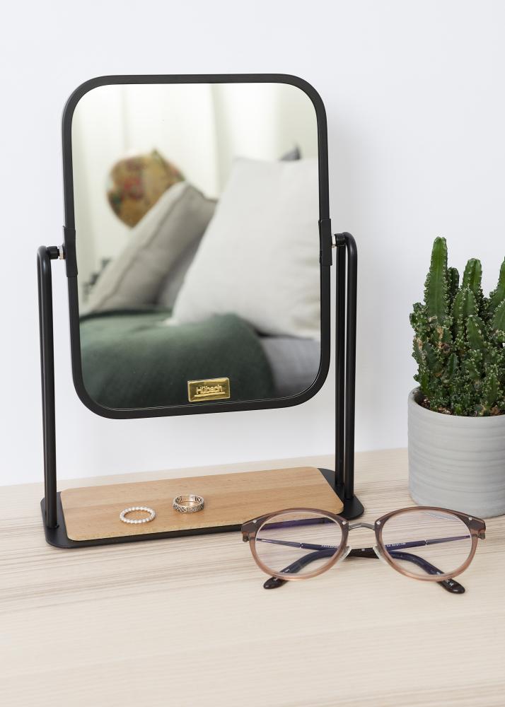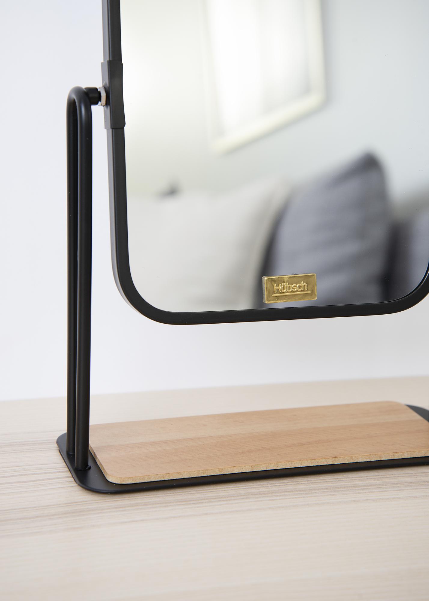 Dieser Tischspiegel ist hübsch und funktionell - auf vielerlei Art und Weise. Rechteckiger Spiegel mit einem schmalen, schwarzen Metallrahmen. Der Spiegelständer ist mit einer kleinen Ablagefläche aus Holz ausgestattet, die perfekt für kleine Dinge ist, die sonst gerne mal verlegt werden oder leicht verloren gehen.