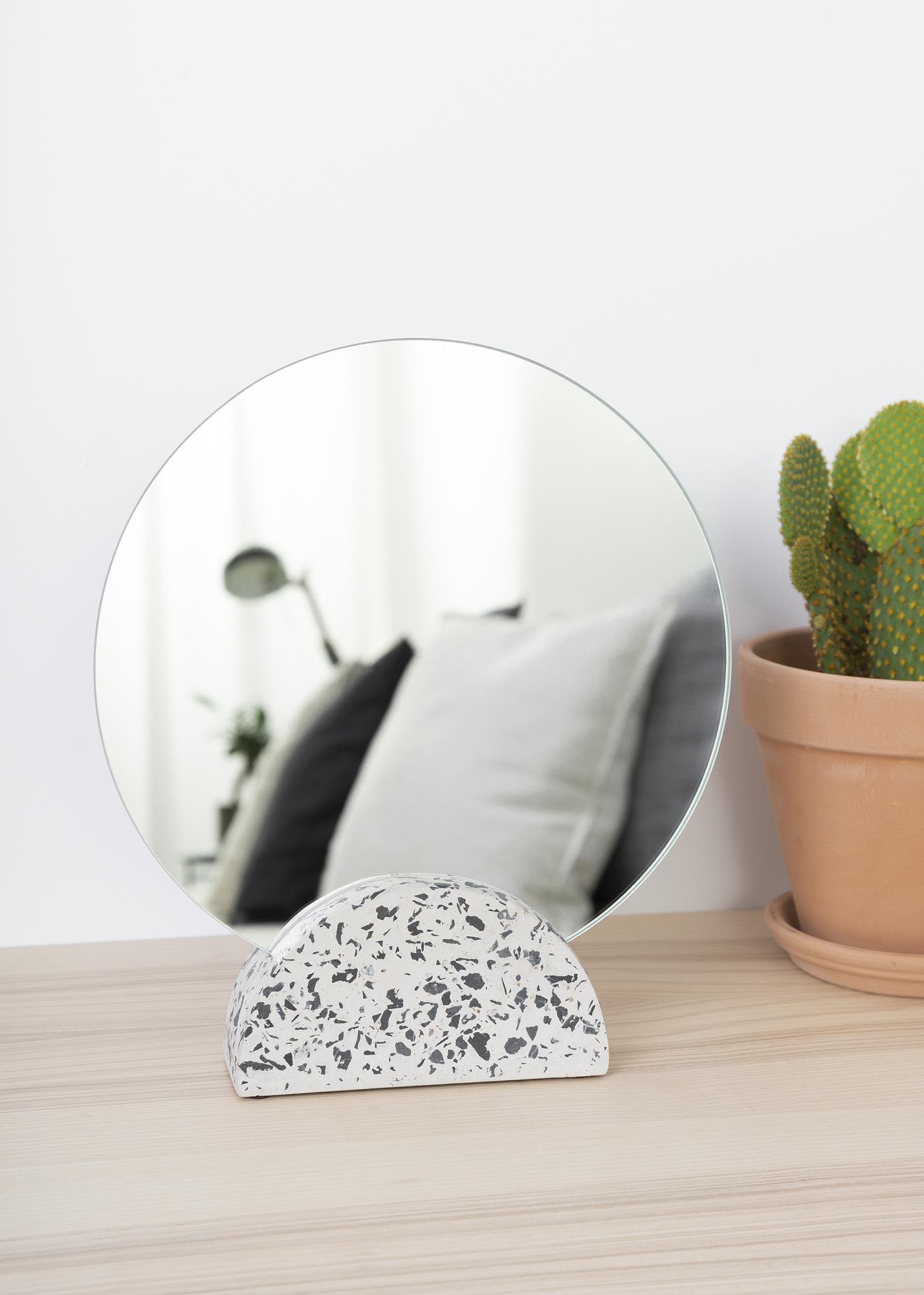 Modernes Design vom Feinsten! Dieser runde Tischspiegel der dänischen Wohndesign-Marke Hübsch ist elegant, ansprechend und natürlich funktionell. Die Halterung ist aus dekorativem, weißen Terrazzo (Kunststein) gefertigt und harmoniert ausgesprochen gut mit dem runden Spiegelglas.