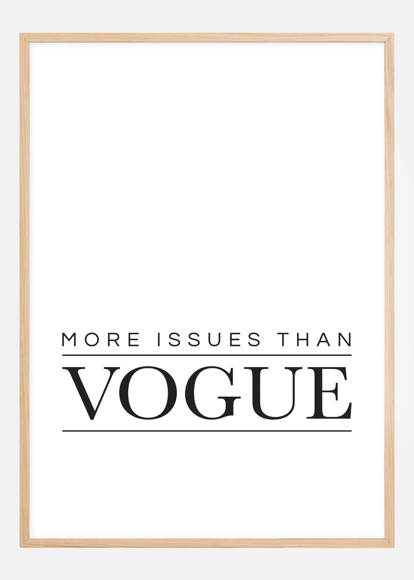 Erstellen Sie eine attraktive Bilderwand zu Hause mit stilvollen poster in verschiedenen Ausführungen! Hier haben wir ein schlichtes, schwarz-weißes Plakat mit einem Motiv in Form des Textes "More issues than Vogue" zusammen mit zwei dekorativen Linien. Das Wort "Vogue" ist in einer Schriftart geschrieben, die an das Logo der großen Modezeitschrift erinnert. Kombinieren Sie es gerne mit einem gold- oder silberfarbenen Rahmen für ein luxuriöses Gefühl. Da das poster in mehreren verschiedenen Größen erhältlich ist, finden Sie leicht eines, das genau zu Ihrer Wand passt.