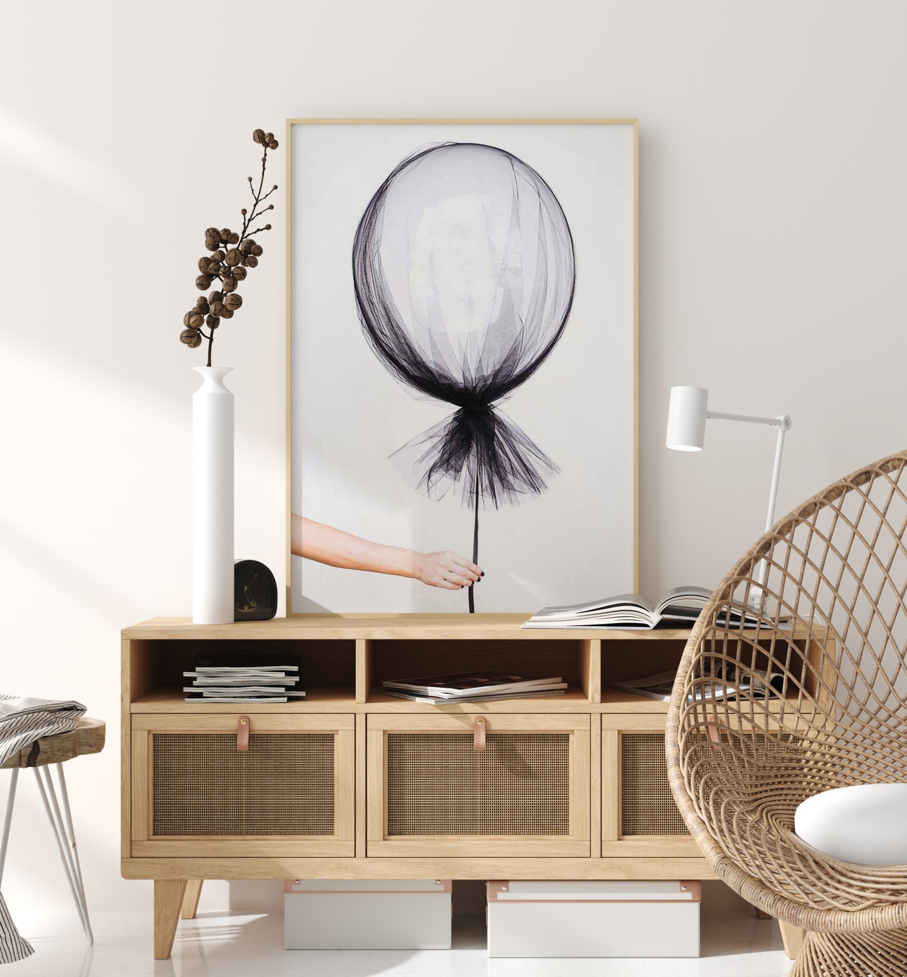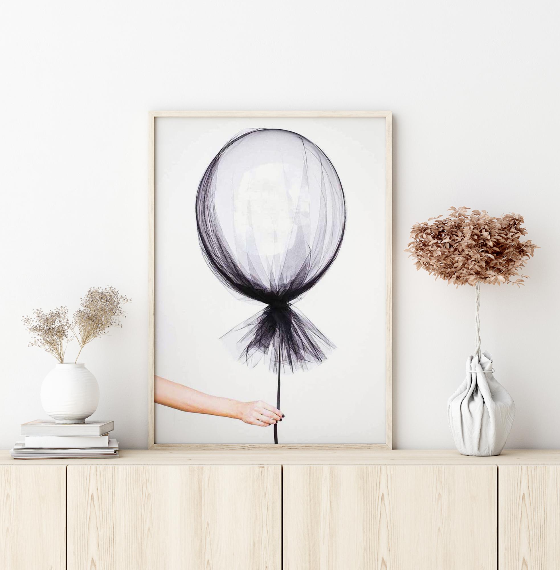 Stilvolle fotografische Kunst eines Händehaltens eines schwebenden Ballons, umhüllt in dünnem, durchsichtigem Stoff. Ein charmantes Poster, das eine herrliche Mischung aus spielerischer Leichtigkeit und zarter Zerbrechlichkeit ausstrahlt. Passt sowohl ins Kinderzimmer als auch in das moderne Zuhause.
