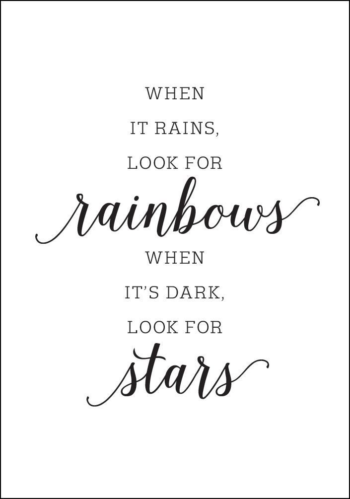 Ein inspirierender Druck mit einem starken Zitat, das Ihr Leben bestimmen sollte. Wenn es regnet, suche nach Regenbögen, wenn es dunkel ist, suche nach Sternen. Worte, nach denen man leben sollte, in diesem einfachen Schwarz-Weiß-Druck. Genießen Sie es und schauen Sie auf die Sonnenseite des Lebens, egal zu welcher Tageszeit Sie dies lesen.