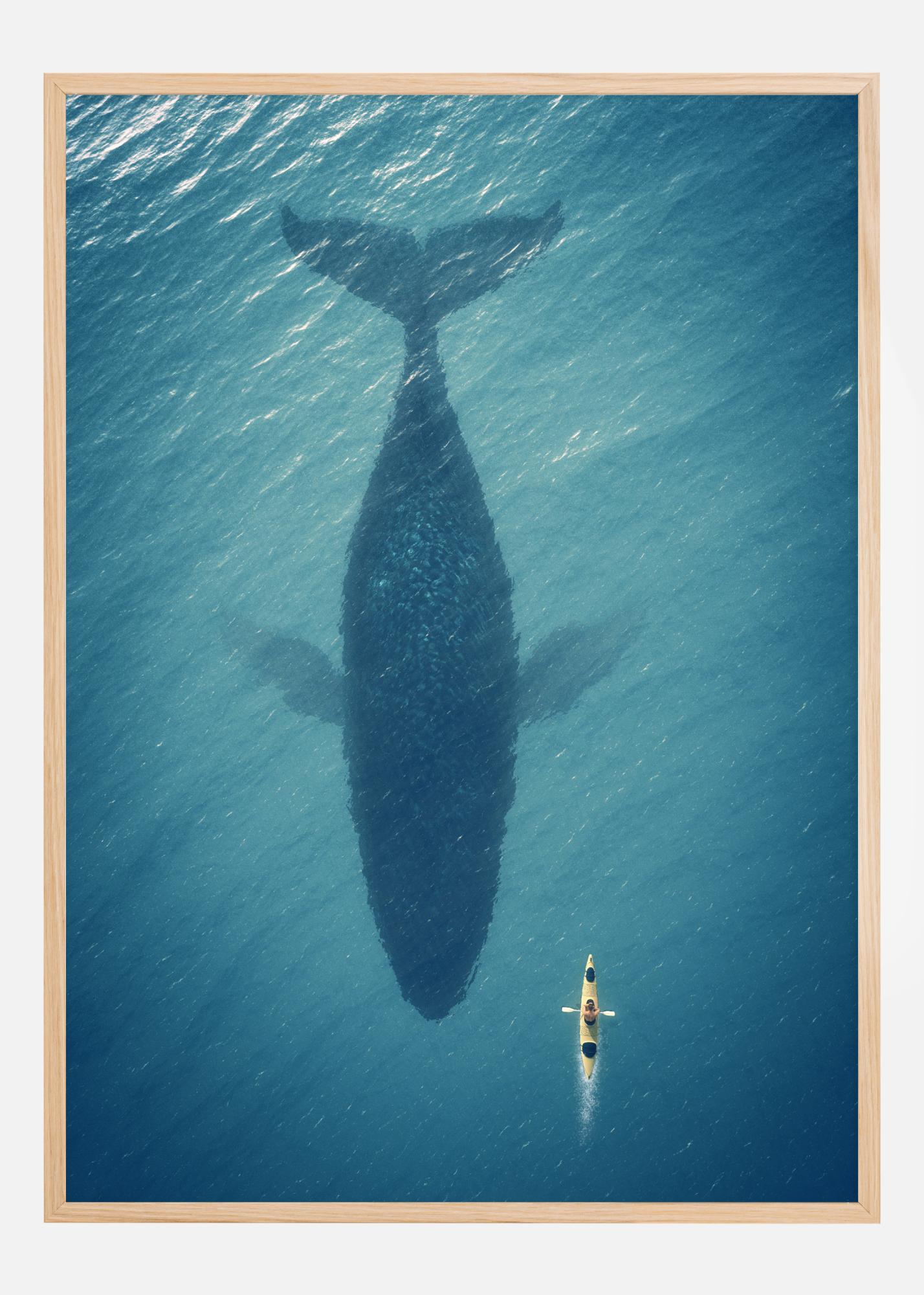 Dieses faszinierende Poster fängt eine Momentaufnahme eines Kajakfahrers ein und die majestätische Silhouette eines Wals, die direkt unter der Oberfläche des glitzernden Meeres auftaucht. Der Kontrast zwischen dem kleinen Wasserfahrzeug und dem riesigen Wal vermittelt ein starkes Gefühl der grandiosen Dimensionen der Natur, während die blaue Farbpalette ein Gefühl der Ruhe und der unbekannten Tiefe des Meeres vermittelt.