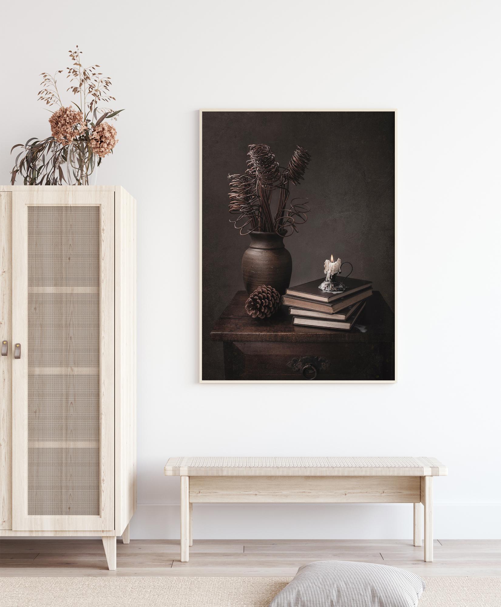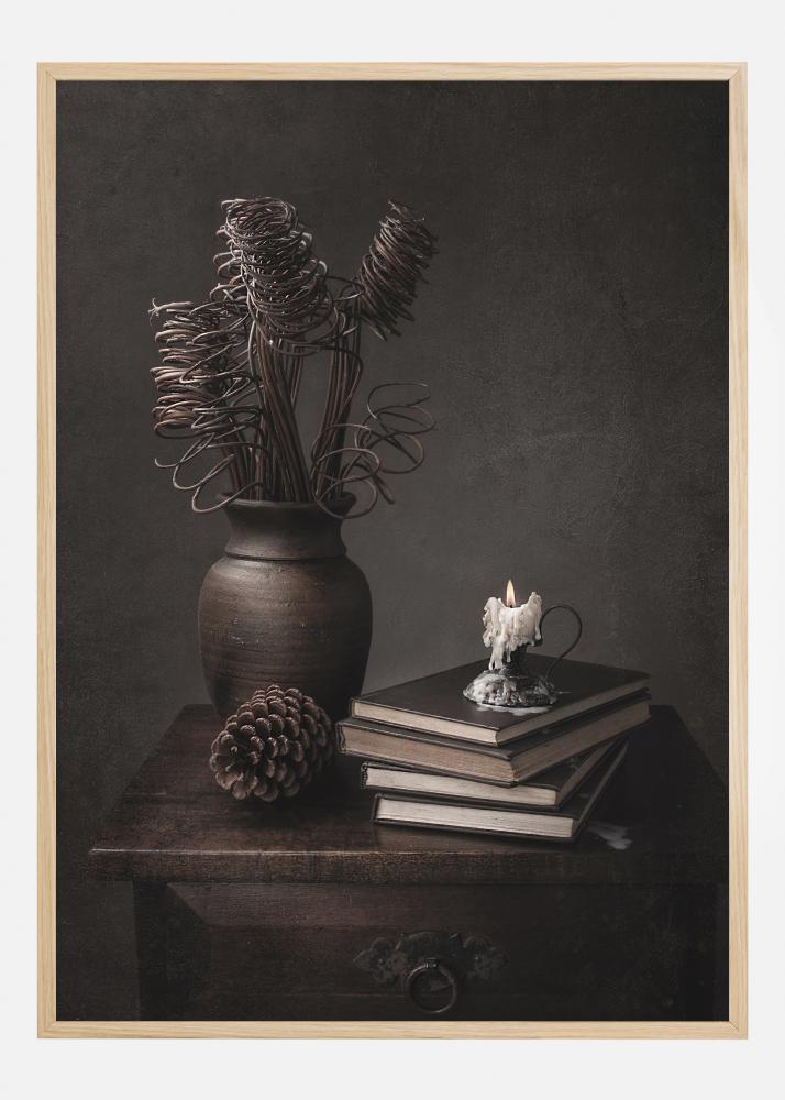 Ein dramatisches Stillleben-Poster mit einem Krug, einem Tannenzapfen, Büchern und einer Kerze auf einer alten Holzkommode. Die getrockneten Blätter der Pflanze lenken den Blick auf das schmelzende Wachs und die Kerzenflamme. Die dunklen Sepia-Farben verleihen einen Hauch von Geheimnis aus einer vergangenen Zeit.