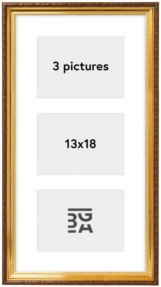 Mit diesem Collagerahmen kannst du deine Wand mit Bildern von Familie, Freunden und schönen Erinnerungen an wundervolle Momente im Leben schmücken. Der Rahmen bietet Platz für 3 Bilder im Format 13x18 cm. Der goldfarbene Rahmen hat einen schönen Retro-Stil mit einer dekorativen Außenleiste in einem warmen Braunton. Eine Wandhalterung ist vorhanden.
