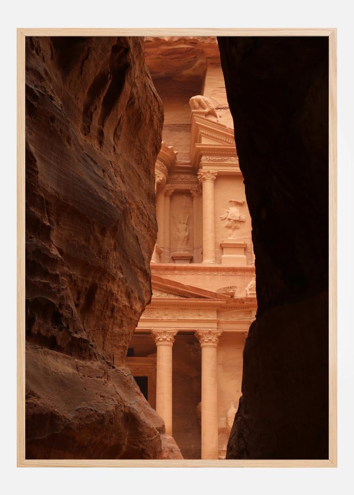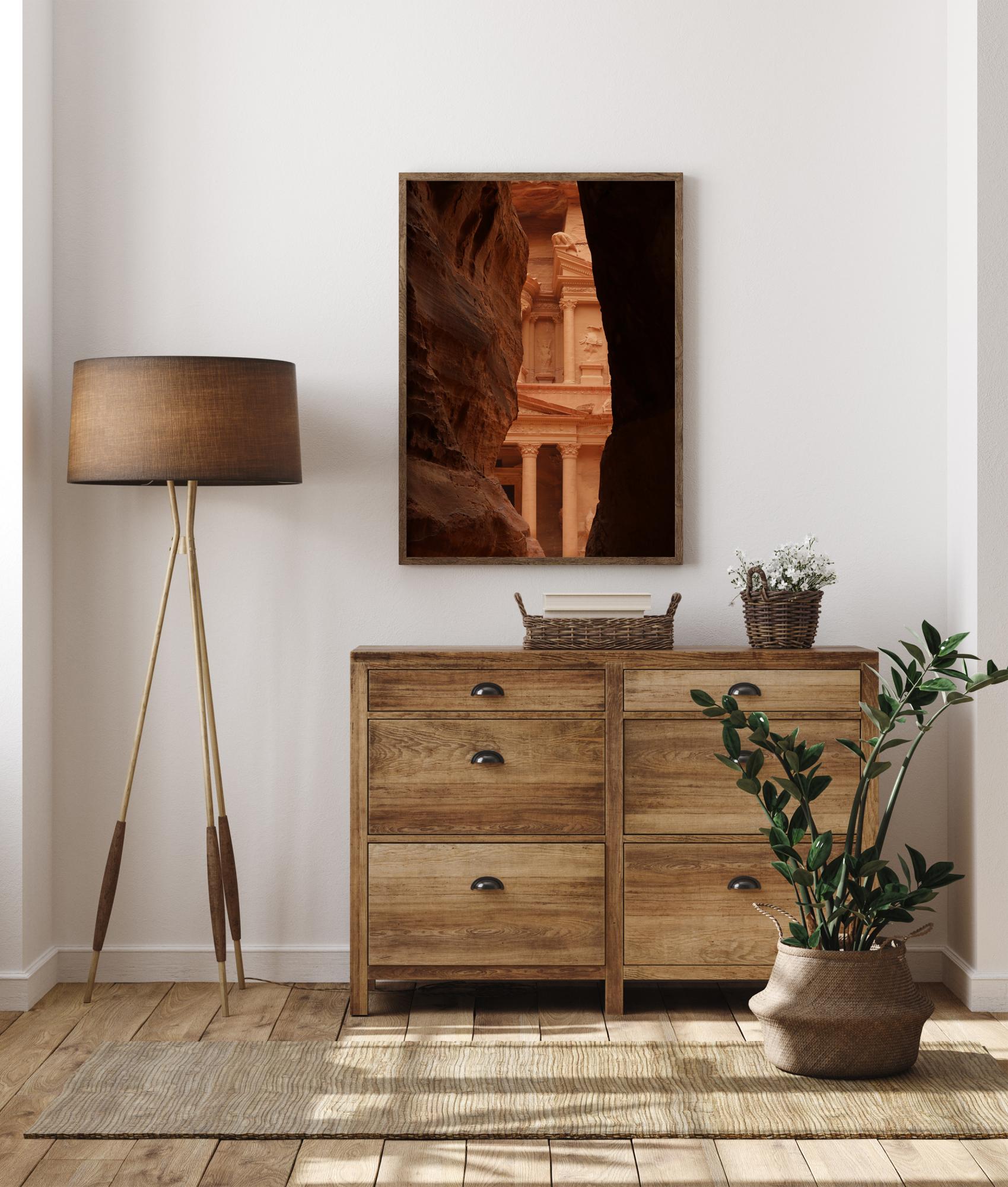 Ein Wahrzeichen-Poster von einer Ecke von Petra in Jordanien. Blicken Sie durch die roten Felsen auf einen Teil der Fassade dieses atemberaubenden Weltwunders der Antike. Hängen Sie es daheim auf und gehen Sie auf Reisen, ohne das Haus zu verlassen, während Sie die alte Architektur dieses berühmten Wahrzeichens von zu Hause aus erkunden.