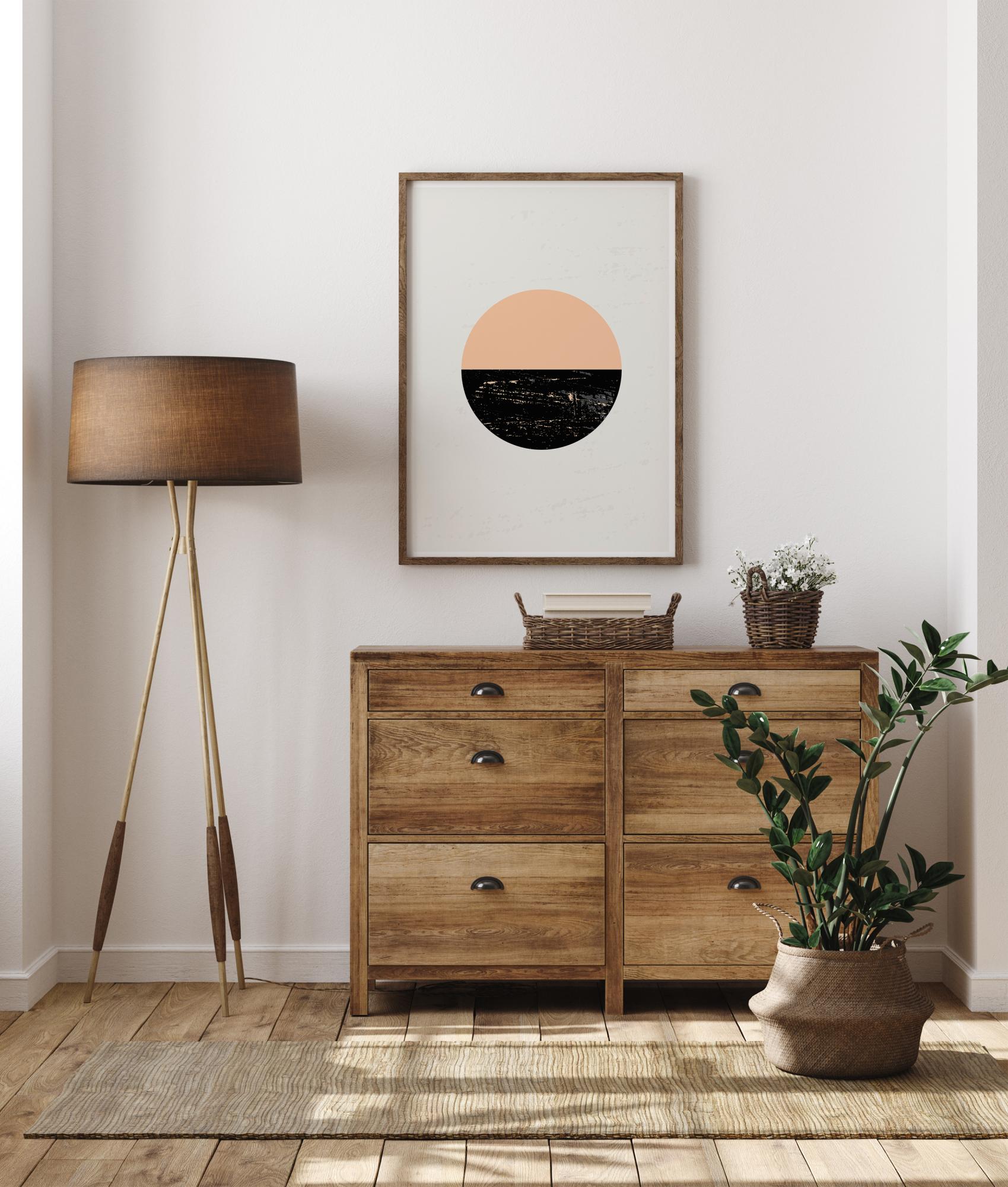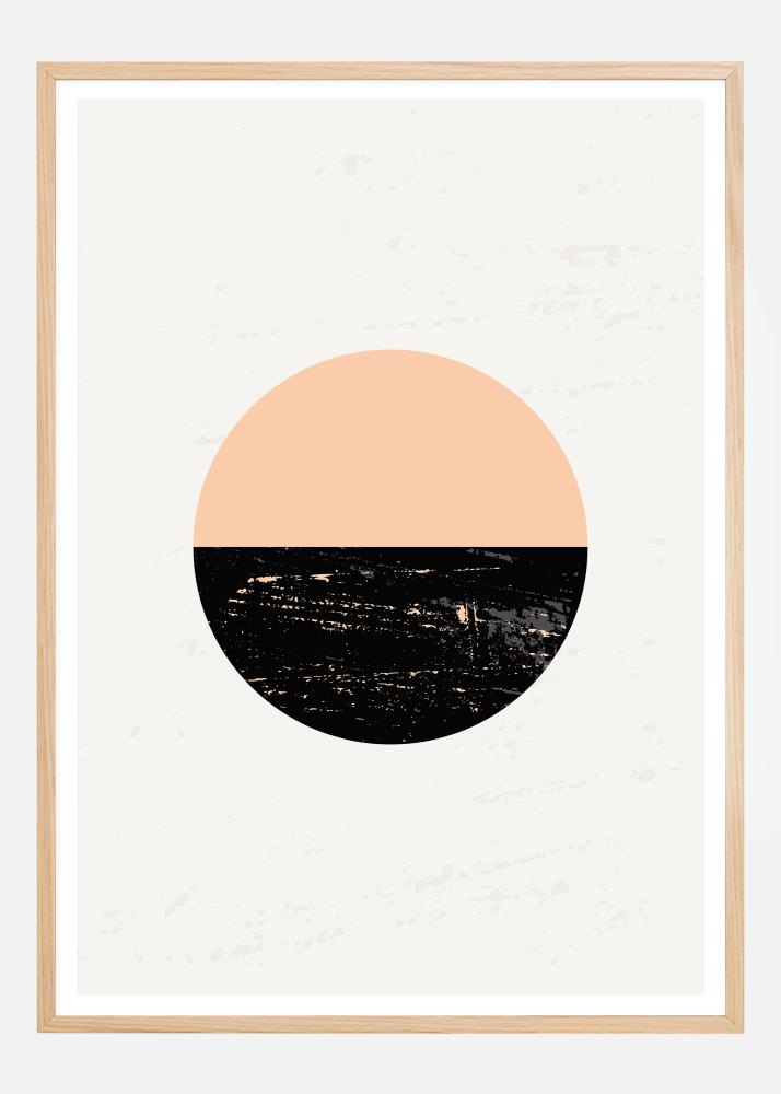 Ein minimalistisches Poster mit einem Kreis in zwei unterschiedlichen Farben. Der Kreis befindet sich auf einem weißen Hintergrund, wobei die obere Hälfte in einem zarten Pfirsich oder Rosa gehalten ist. Die untere Hälfte ist schwarz mit dem Design einer nächtlichen Stadtlandschaft, die Lichter blinken in der Dunkelheit. Sorgen Sie für Gesprächsstoff, wenn Sie dieses Poster mit nach Hause nehmen.