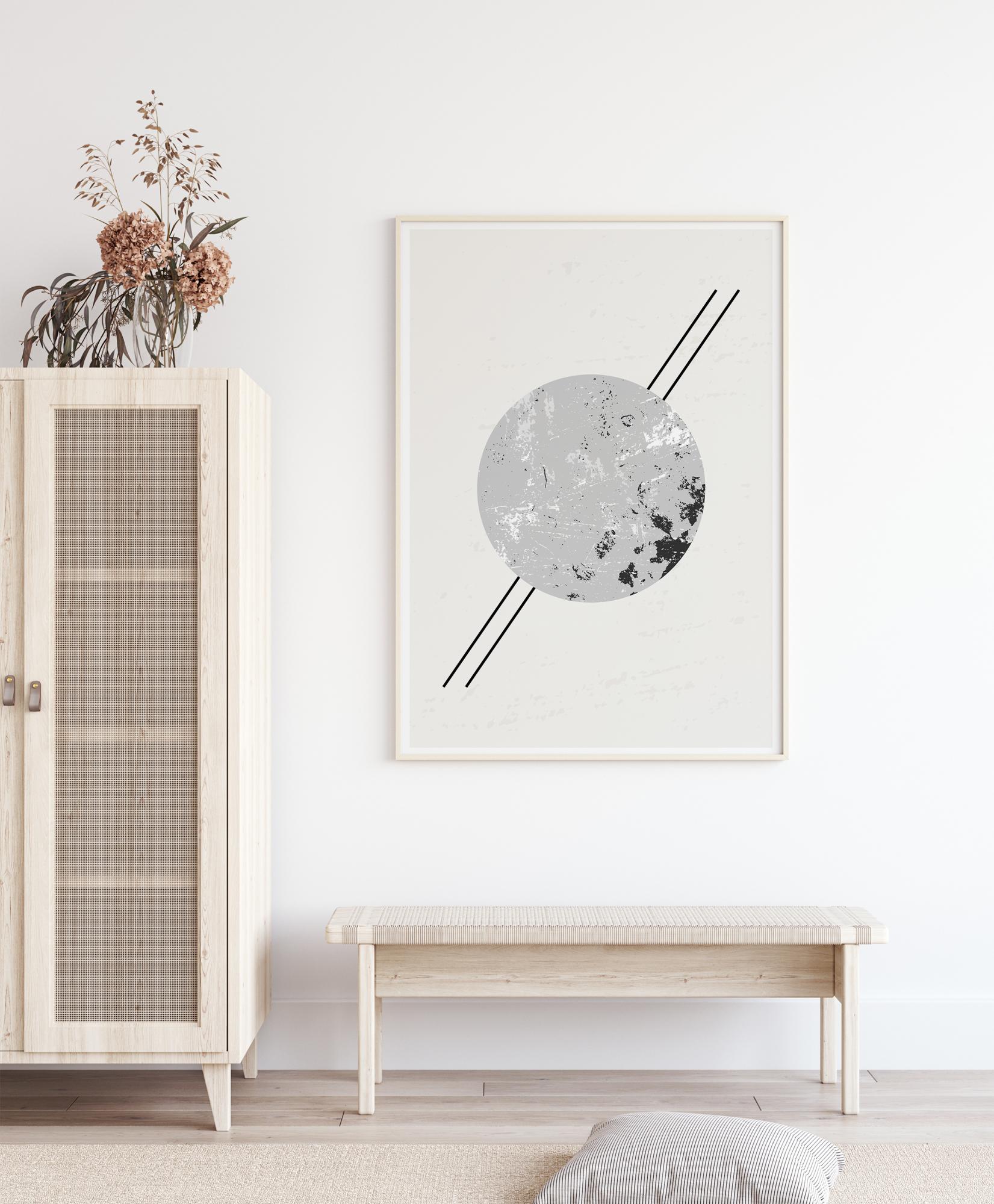 Ein abstraktes Poster mit einem Kreis, durch den zwei gerade Linien verlaufen. Das sanfte Entenei-Blau des Kreises wird durch einen dunkelblauen und weißen Marmoreffekt betont, der es wie die Erde aus dem Weltraum aussehen lässt. Dieses Poster wirkt kontemplativ, wenn Sie es auf einer zart pastellfarbenen Wand anbringen.