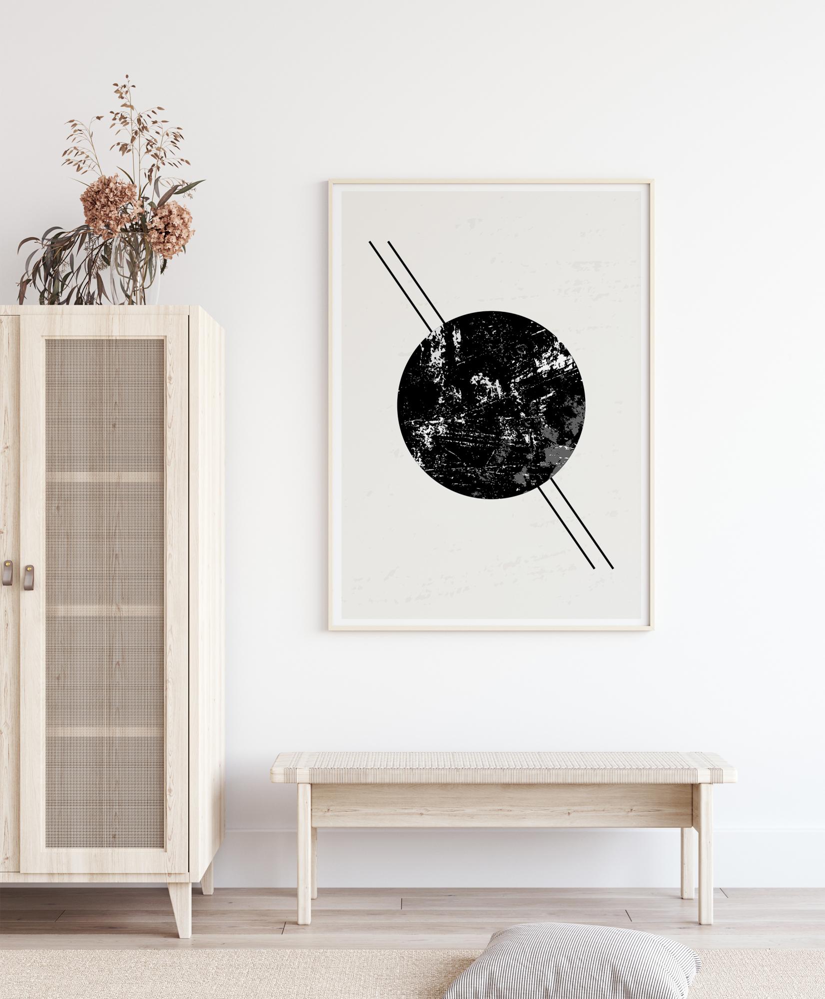 Ein starkes abstraktes Poster mit einem schwarzen Kreis und zwei Linien, die von links oben nach rechts unten verlaufen. Der schwarze Kreis hat einen weißen und grauen Marmoreffekt, die beiden schwarzen Linien ähneln fast den Ringen des Saturns. Holen Sie sich dieses Poster nach Hause und sehen Sie sich die vielen Möglichkeiten an, die in diesem zum Nachdenken anregenden Werk stecken.