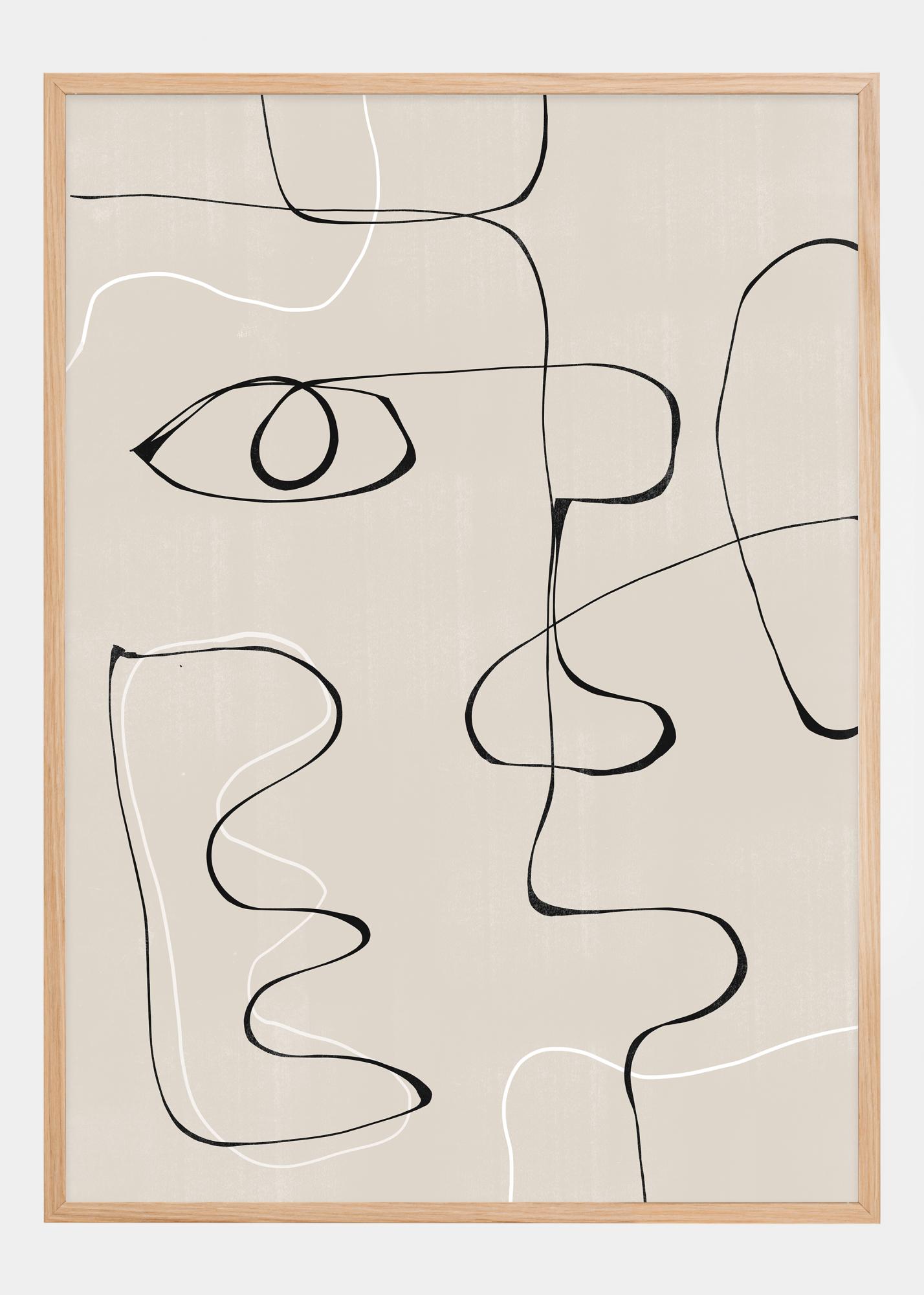 Dieses Poster strahlt minimalistische Eleganz mit seinem abstrakten Linienspiel aus, das eine Gesichtskontur andeutet. Das einsame Auge in der Mitte hinterlässt einen tiefen und durchdringenden Eindruck, umgeben von geschwungenen Kurven, die andere Gesichtszüge darstellen könnten. Das abstrakte Konzept ist perfekt für diejenigen, die Kunst schätzen, die eine Geschichte erzählt, ohne explizit jedes Detail zu offenbaren.