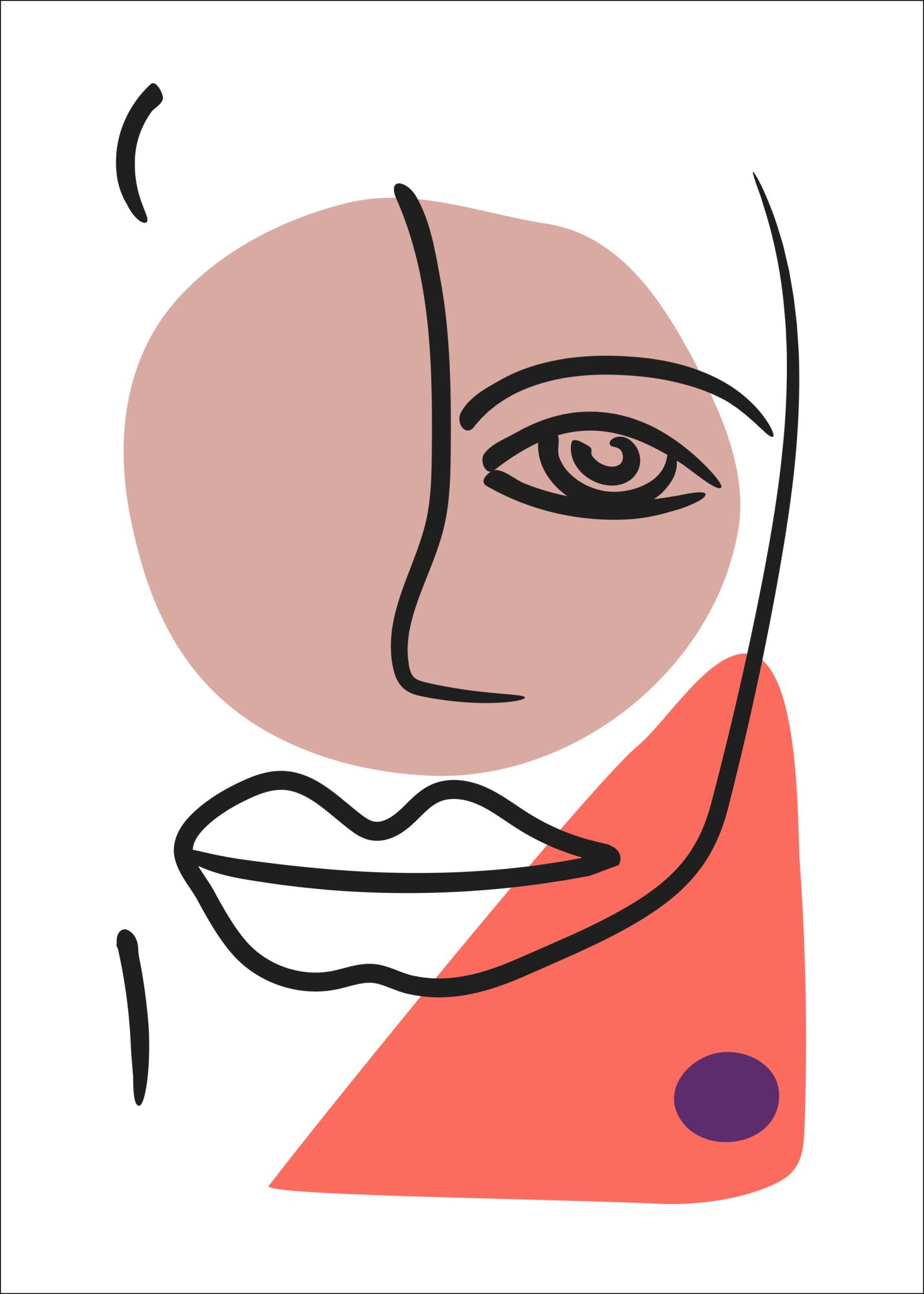 Ein abstraktes Poster eines Gesichts mit Augen, Nase und vollen Lippen. Die schwarzen Linien des Gesichts sind auf einem rosafarbenen Kreis und einem pfirsichfarbenen Dreieck platziert, um einen dramatischen Effekt zu erzielen. Entdecken Sie die Emotionen und lassen Sie sich täglich von diesem einzigartigen Poster inspirieren, das eine brillante Fantasie hervorruft.