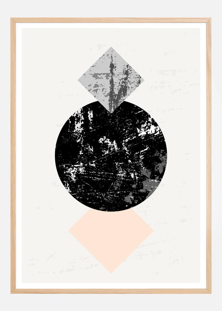 Ein geometrisch abstraktes Poster mit zwei Quadraten, die einen Kreis umschließen. Der schwarze Kreis ist weiß marmoriert und wird von einem blau marmorierten Quadrat und einem rosafarbenen Quadrat flankiert. Jedes dieser Quadrate steht auf einem Punkt und lenkt den Blick auf den erdförmigen Kreis in der Mitte. Bringen Sie mit diesem Statementstück Dramatik an eine einfache Wand.