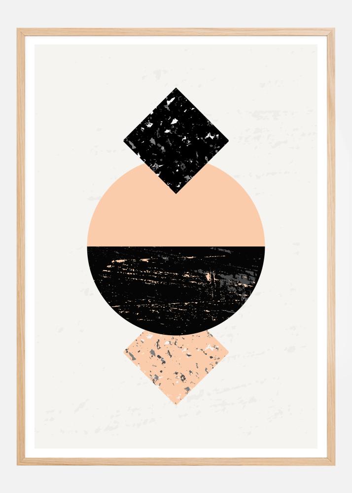Ein kontrastreiches geometrisches Poster mit abstrakten Quadraten und Kreisen. Der große Kreis in der Mitte ist in eine pfirsichfarbene obere Hälfte und eine schwarze untere Hälfte unterteilt, die wie eine Stadt bei Nacht aussieht. Im Kontrast dazu steht ein rosafarbenes Quadrat vor der Dunkelheit und ein schwarzes Quadrat auf dem pfirsichfarbenen Teil des Kreises.