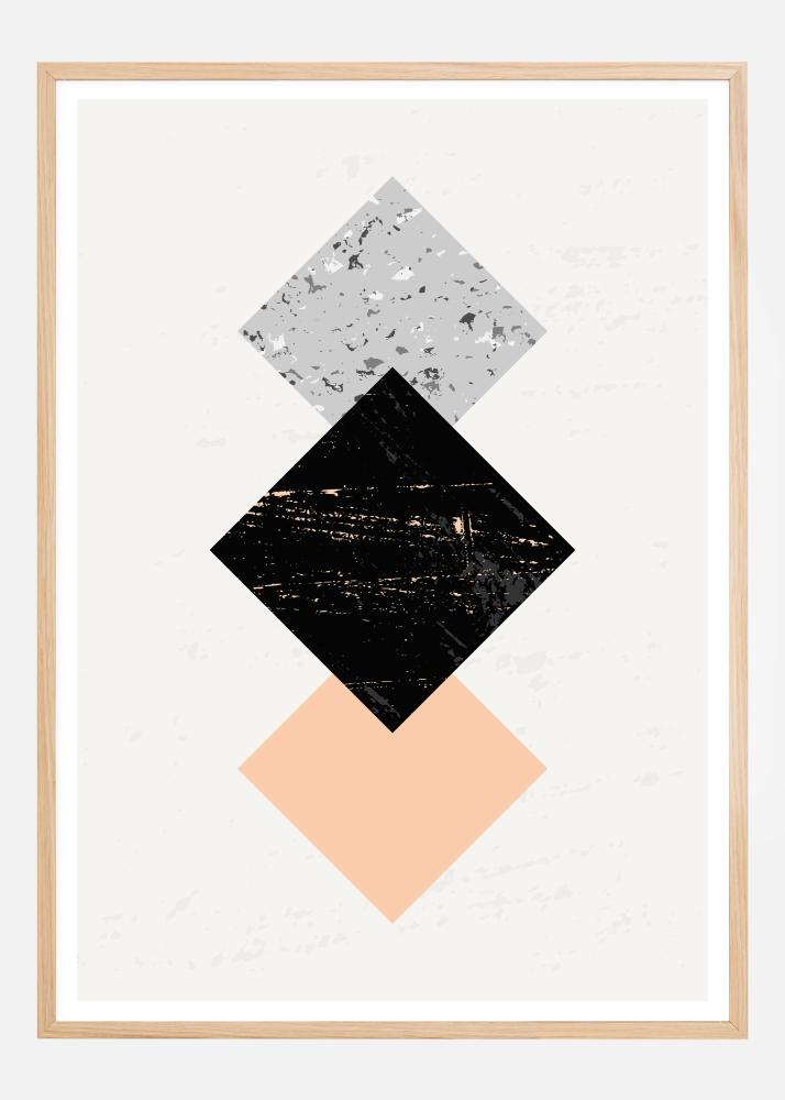 Ein geometrisches Poster mit drei verschiedenfarbigen Quadraten. Der Fokus liegt auf einem dunklen schwarzen Quadrat, das jedoch durch ein blaues Quadrat darüber und ein rosa Quadrat darunter mit zusätzlichen Mustern aufgelockert wird. Hängen Sie dieses Poster in Ihrem Flur oder in einem Raum mit natürlichem Licht auf, ohne dass es zu aufdringlich wirkt.