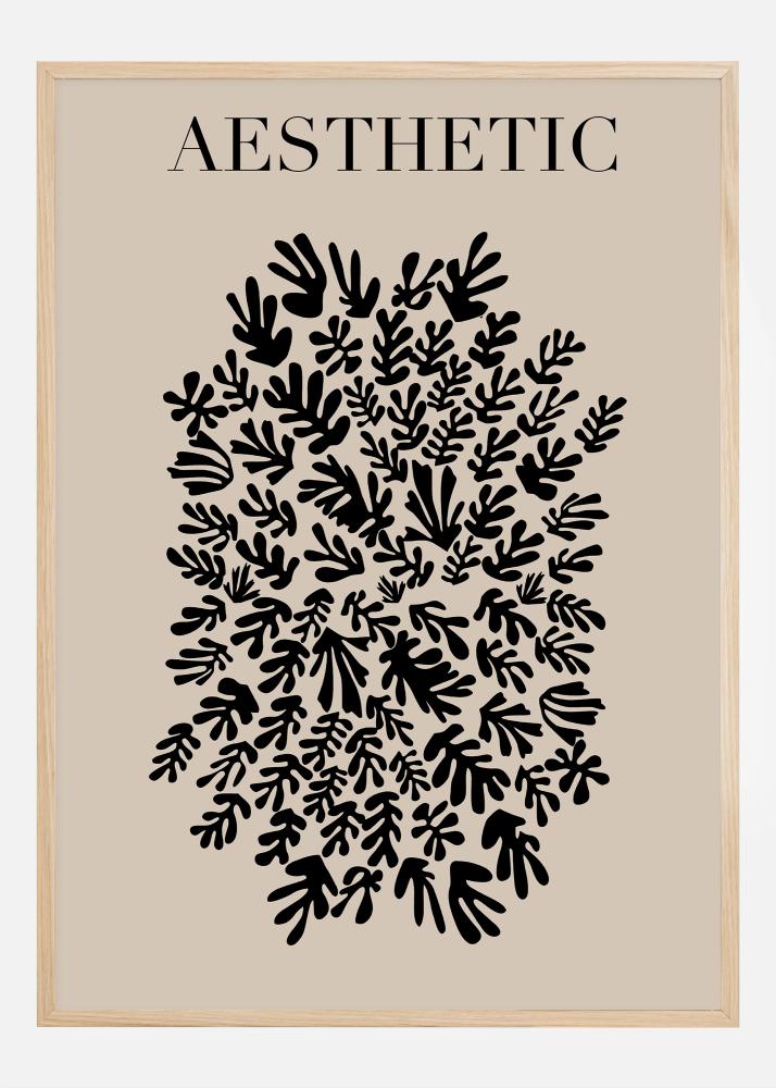 Mit seinem modernen Ausdruck und der einfachen Farbpalette, die auf Schwarz und Beige beschränkt ist, vermittelt dieser Druck einen beruhigenden und ausgeglichenen Eindruck. Das Wort "AESTHETIC", das im oberen Bereich des Motivs platziert ist, dient als kraftvolle Erinnerung an die ewige Schönheit von Design und Natur. Dieses Poster würde sich ausgezeichnet in einer Einrichtung machen, in der man eine Oase von Ruhe und Inspiration schaffen möchte, oder als Teil einer größeren Bilderwand, um ein einheitliches visuelles Erlebnis zu schaffen.