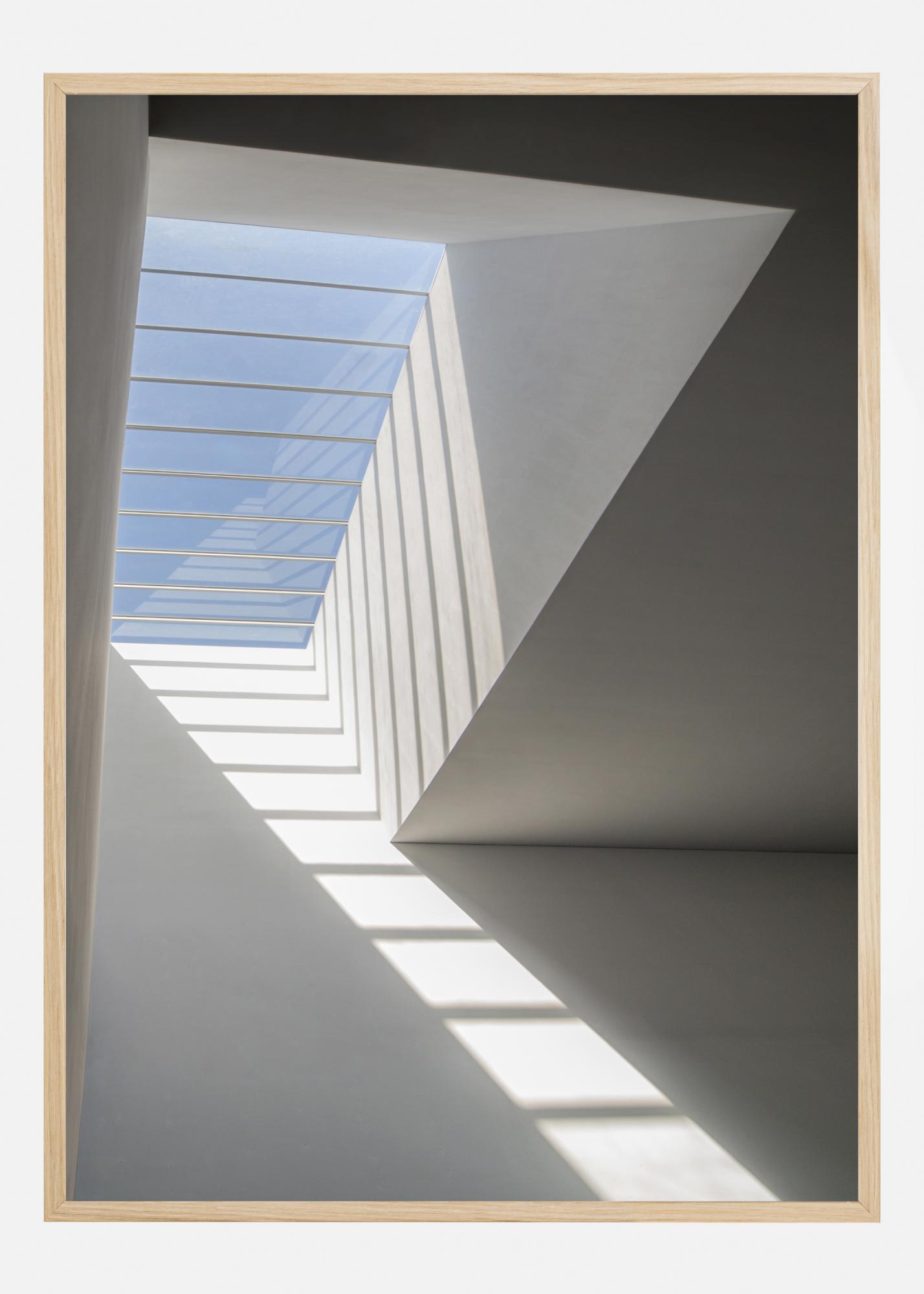 Ein einfaches, luftiges Poster eines hellen, weißen Innenraums. Auf der linken Seite befindet sich eine Dachgaube, durch die der blaue Himmel zu sehen ist. Das einfallende Licht wirft Schatten, die wie eine Leiter aussehen. Diese führen das Auge hinauf zu dem Licht im Freien. Bringen Sie mit diesem friedlichen Bild Helligkeit in einen dunklen Raum.