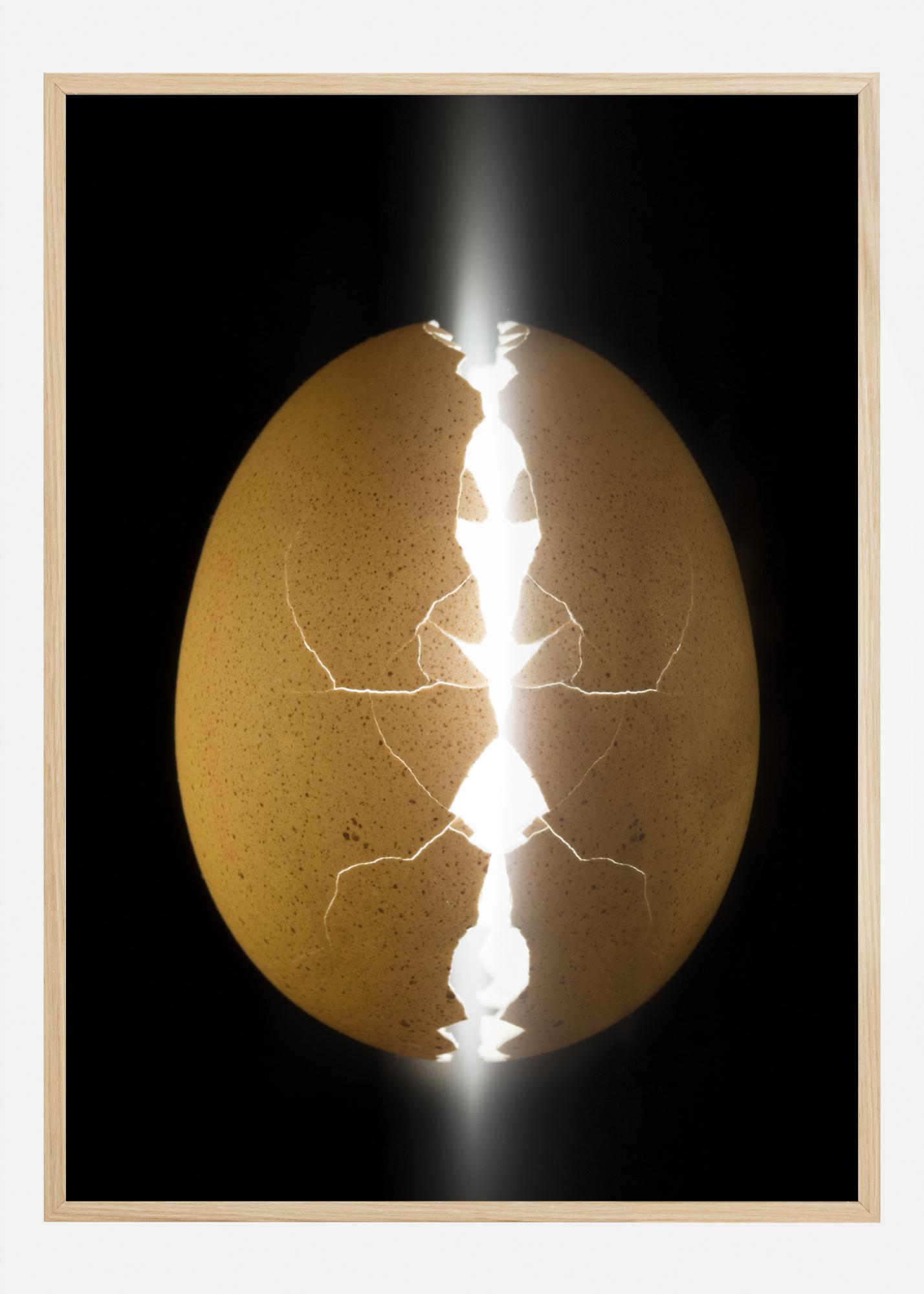 Ein dramatisches, abstraktes Poster mit einem aufbrechenden Ei, von dem helles Licht ausgeht, auf einem schwarzen Hintergrund. Das Licht bricht in einem atemberaubenden symmetrischen Muster durch das Ei. Die Lichtstrahlen durchdringen die Dunkelheit und ergeben ein abstraktes, gleichzeitig fesselndes Bild, das sich perfekt für jede Wand in Ihrem Zuhause eignet.
