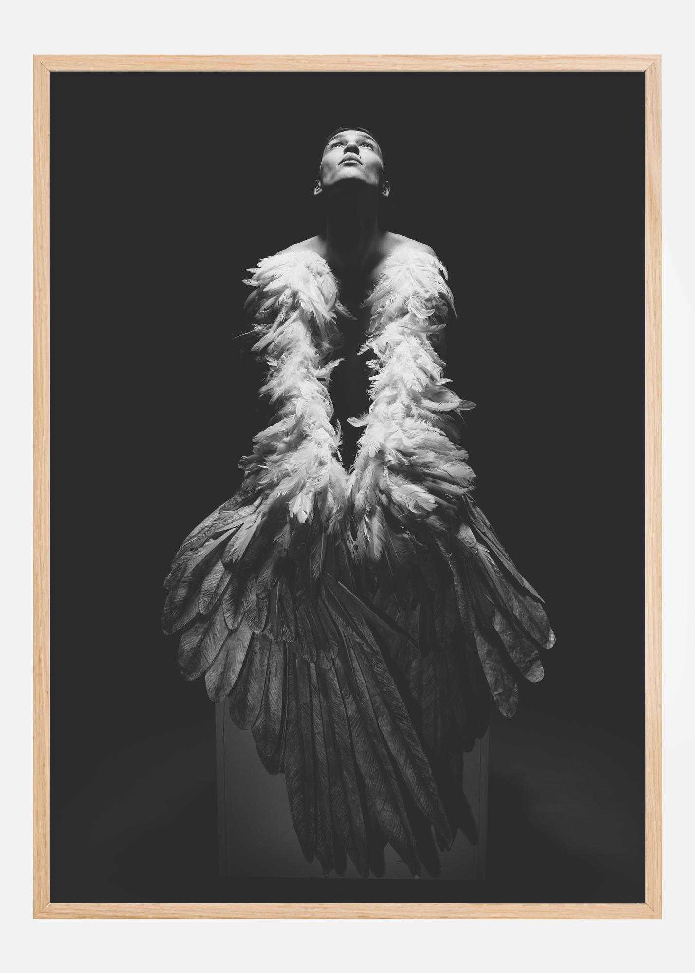 Ein Portraitposter eines Mannes in einem langen gefiederten Outfit, der das Fliegen nachahmt. Er steht vor einem schlichten schwarzen Hintergrund und blickt in den Himmel. Ein Scheinwerfer leuchtet von oben und hebt sein Gesicht und seine Schultern hervor, so dass Sie sich auf ihn konzentrieren, wenn Sie dieses dramatische Werk betrachten.