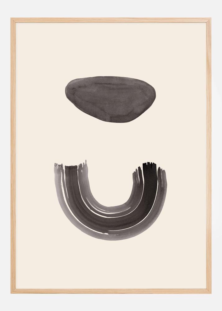 Ein elegantes abstraktes Poster mit einem Bogen und einem Stein. Der Stein ist in der Mitte eines weißen Hintergrunds aufgehängt, der umgedrehte Bogen direkt darunter lässt ihn wie ein seltsames lächelndes Gesicht aussehen. Ist es ein Magnet unter dem Stein? Lassen Sie sich auf eine Interpretation ein, wenn Sie dieses Werk zu Hause ausstellen.
