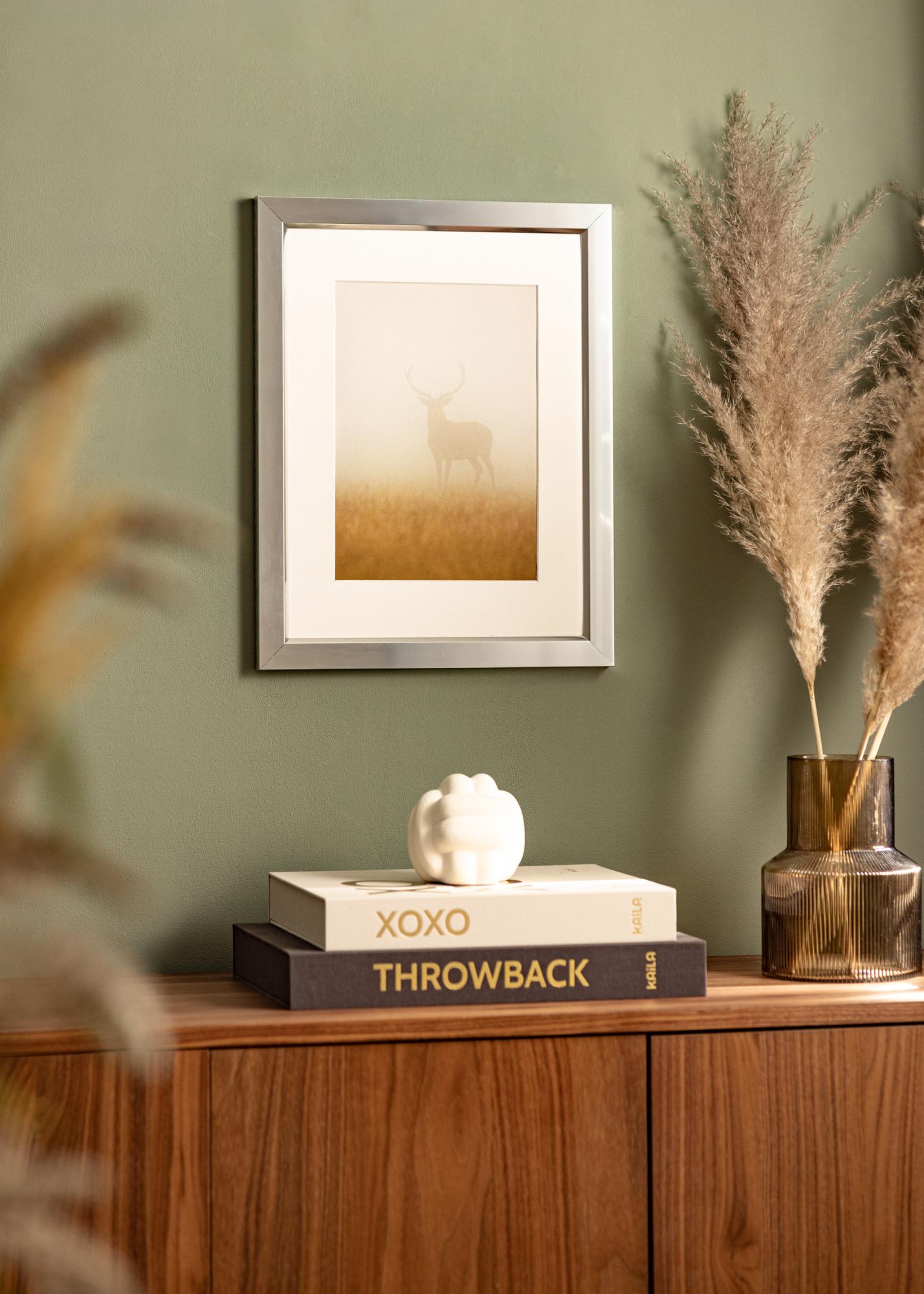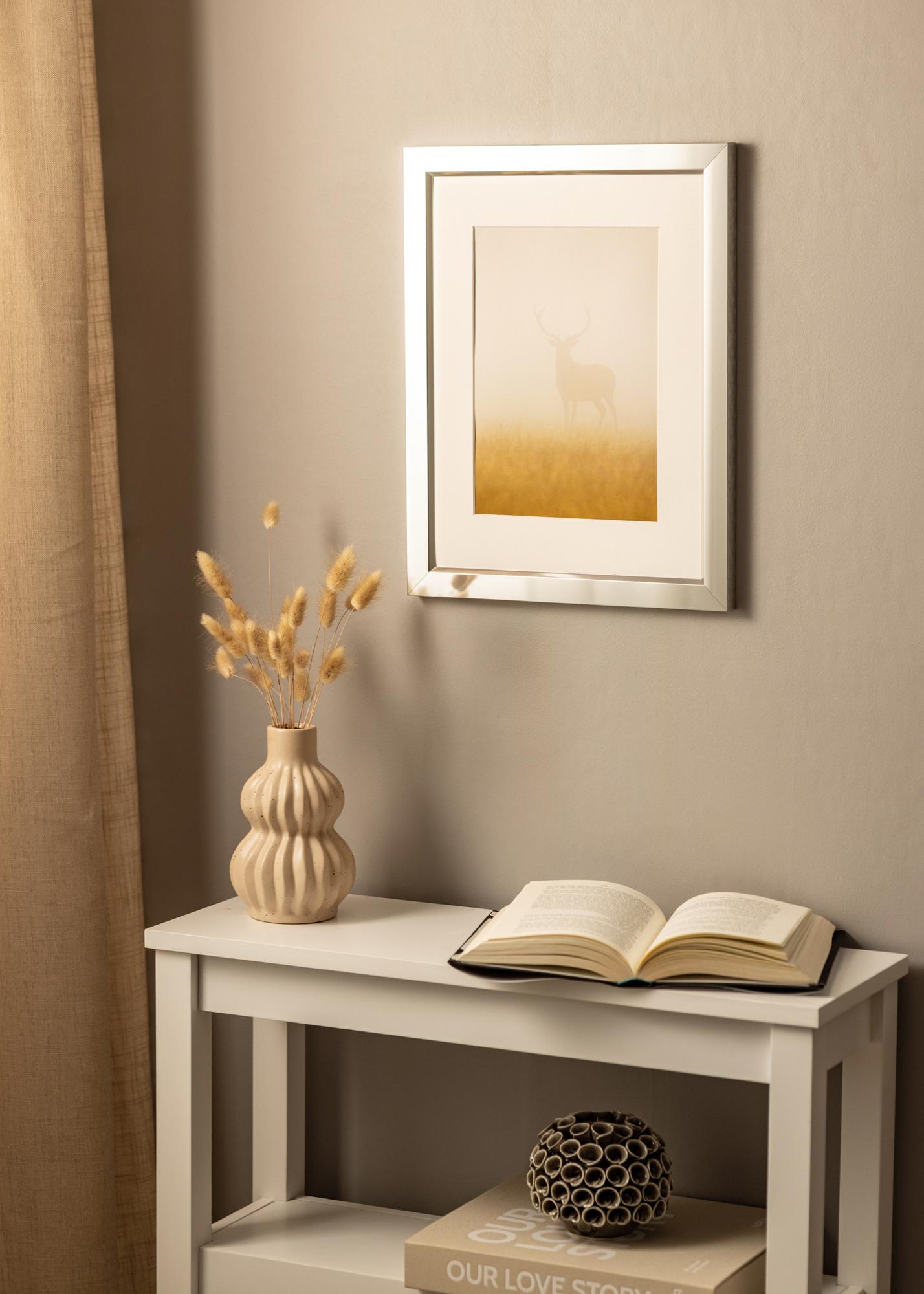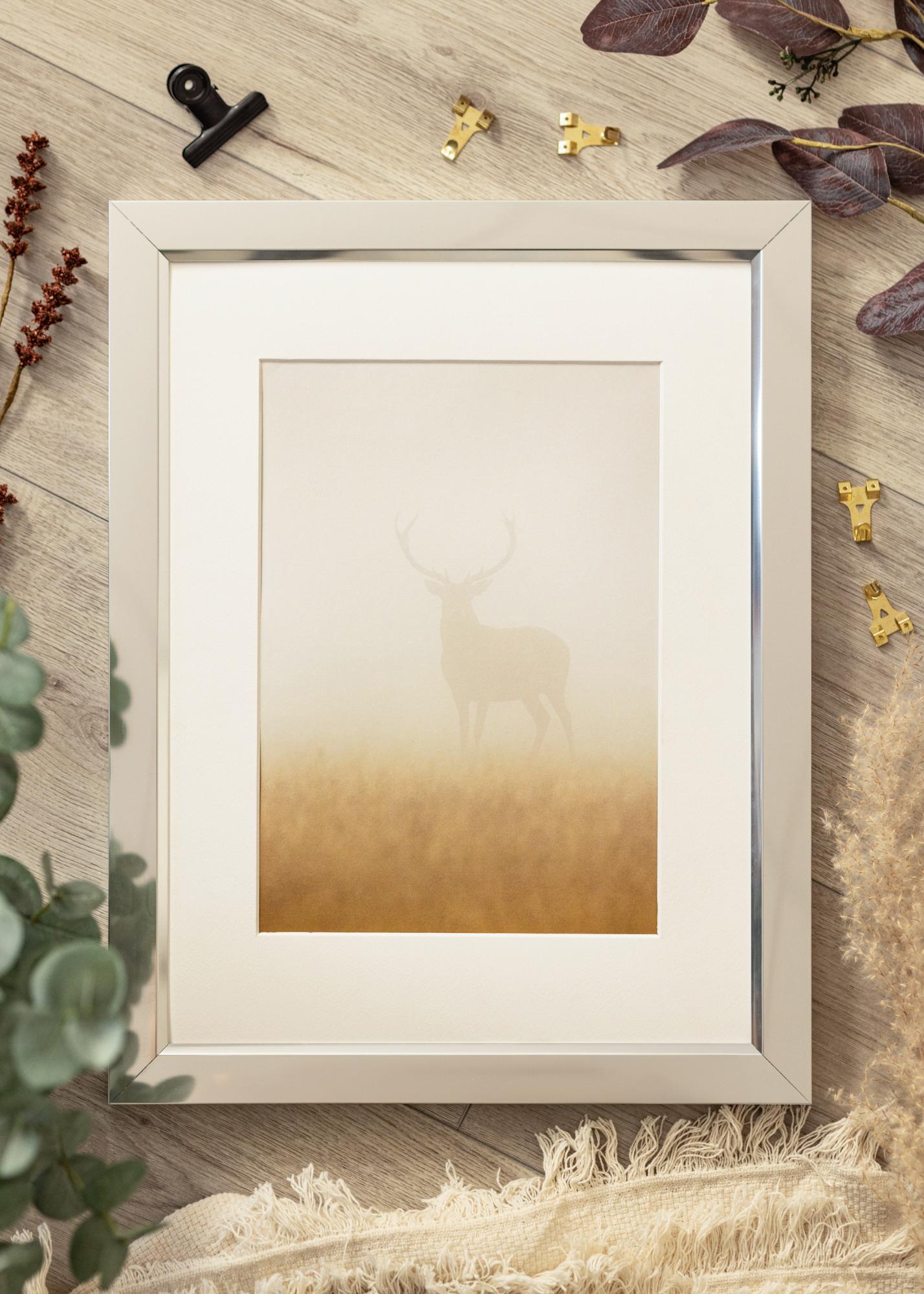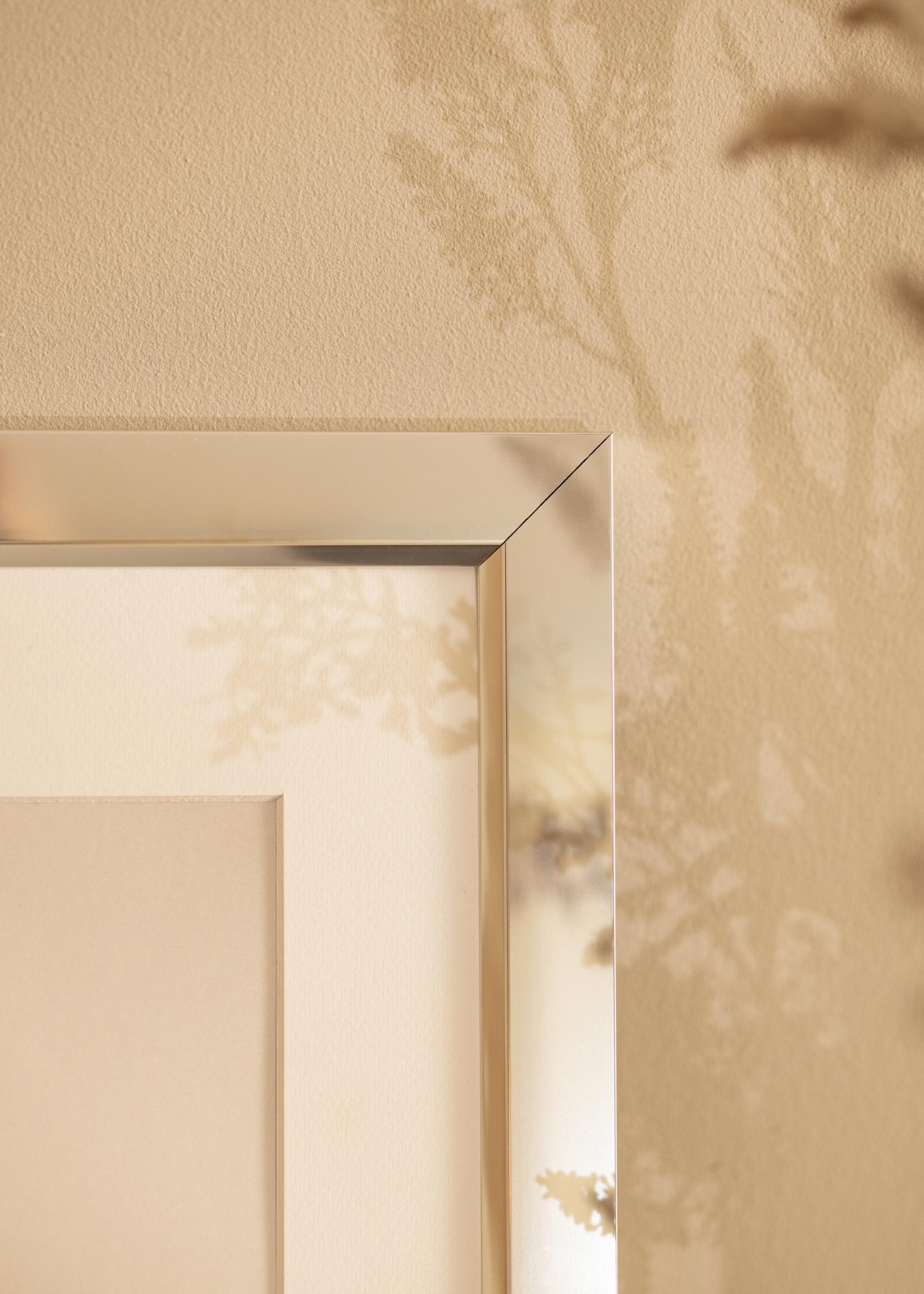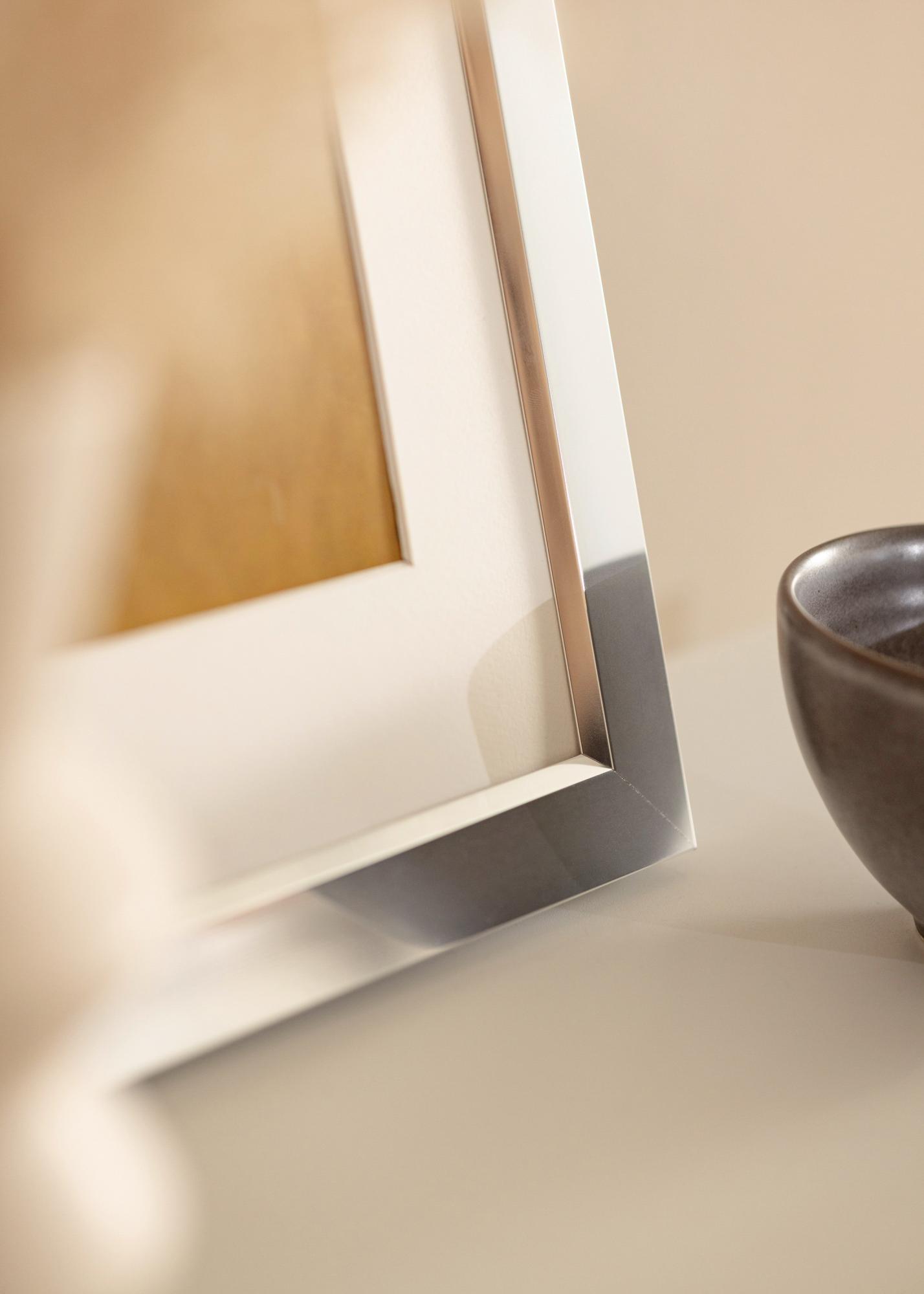 Schicker glänzender Silberrahmen, der an Spiegelglas erinnert und aus Qualitätsrahmenleisten aus Aluminium in Deutschland hergestellt wurde. Das hochglänzende Aussehen zieht die Augen auf sich, reflektiert Licht auf eine schöne Weise und lenkt den Fokus auf das Motiv. Das minimalistische Design des Rahmens passt gut in moderne Einrichtungen, kann aber auch in anderen Einrichtungsstilen einen schönen Akzent setzen. Ergänze den Rahmen mit einem Passepartout, um das Bild richtig zur Geltung zu bringen.