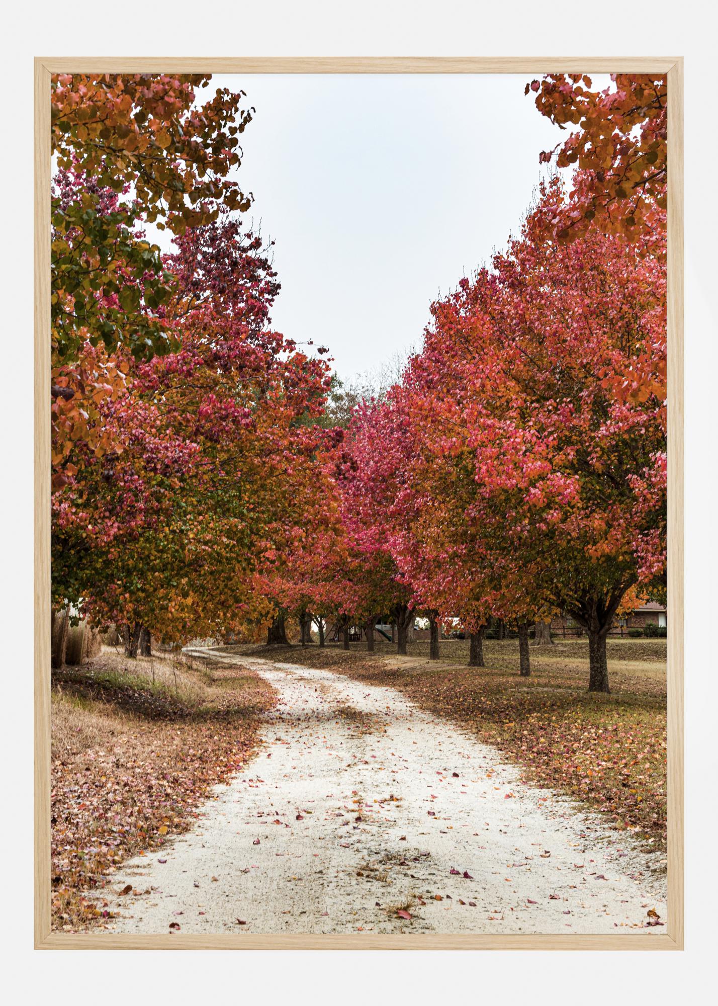 Ein Landschaftsposter eines herbstlichen Parks und einer Allee. Eine weiße Schotterstraße schneidet durch virbrierend rot belaubte Bäume. Der blasse blaue Himmel spiegelt die Straße wider, wie sie sich in der Ferne schlängelt. Erleben Sie die Schönheit des Herbstes jeden Tag aufs Neue, wenn Sie dieses Poster Ihrem Heim zufügen. Sie können dieses Gemälde neben jedes andere Kunstwerk hängen.