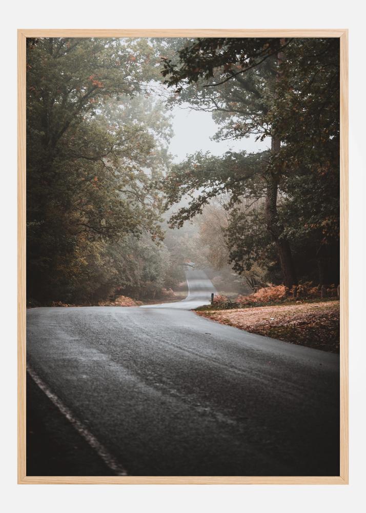 Dieses stimmungsvolle Poster fängt die ruhige Essenz einer herbstlichen Landstraße ein, die von Laubwald umgeben ist. Der Nebel, der über der Straße schwebt, und die roten und grünen Herbstblätter der Bäume verleihen ein Gefühl von Mystik und Veränderung. Der nasse Asphalt reflektiert subtil die Farben des Waldes und trägt zu dem allgemeinen Gefühl von Tiefe und Introspektion bei, das das Bild vermittelt.