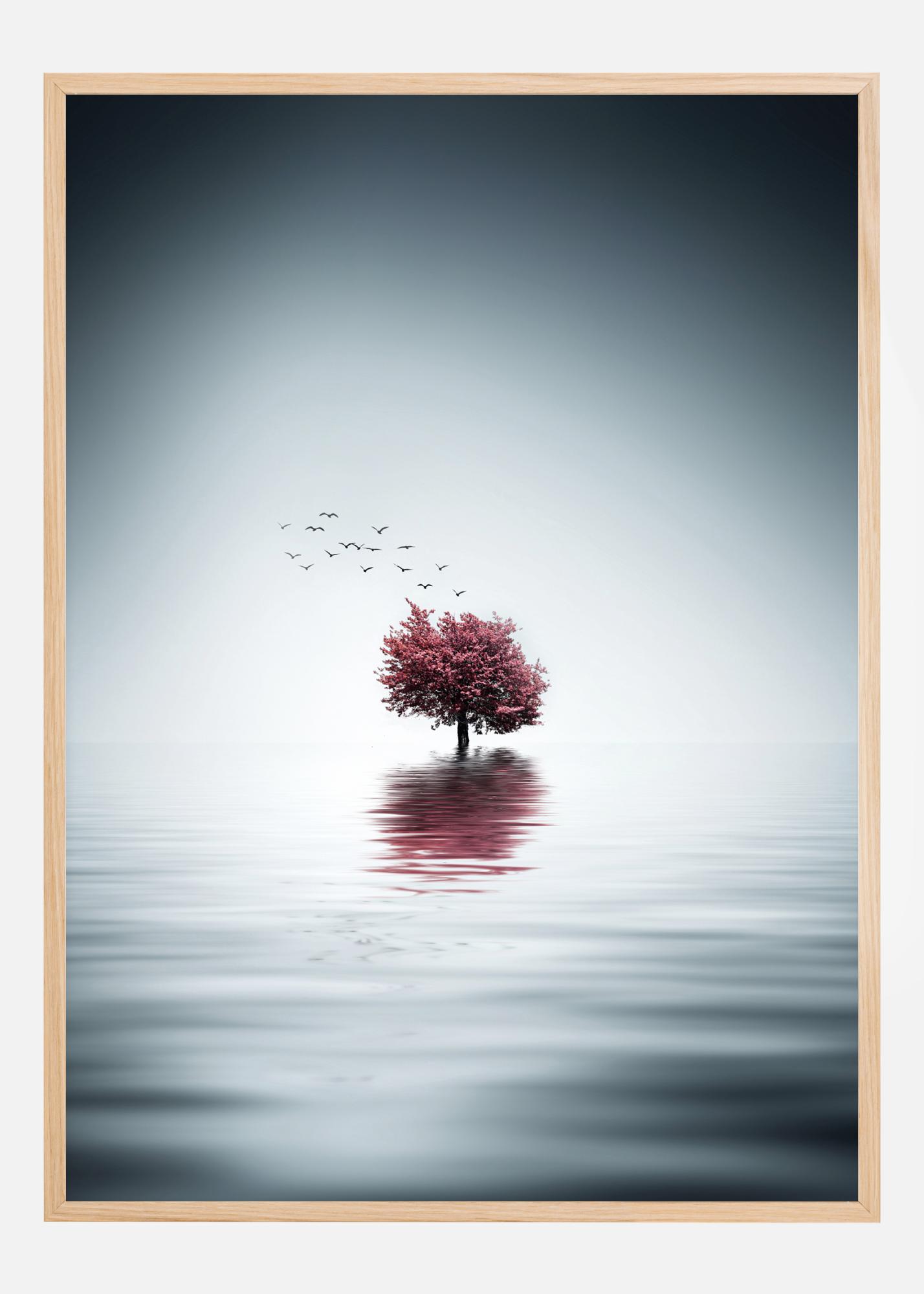 Ein einfaches Naturposter der Leere mit einem einsamen Baum in der Mitte. Die kräftigen Farben und die Wellen lenken das Auge zum kleinen strahlend pinkfarbenen Kirschbaum in voller Blüte. Ein Schwarm Vögel zieht vorbei, umspielt von Licht. Sie können die mystische Natur dieser Welt spüren.