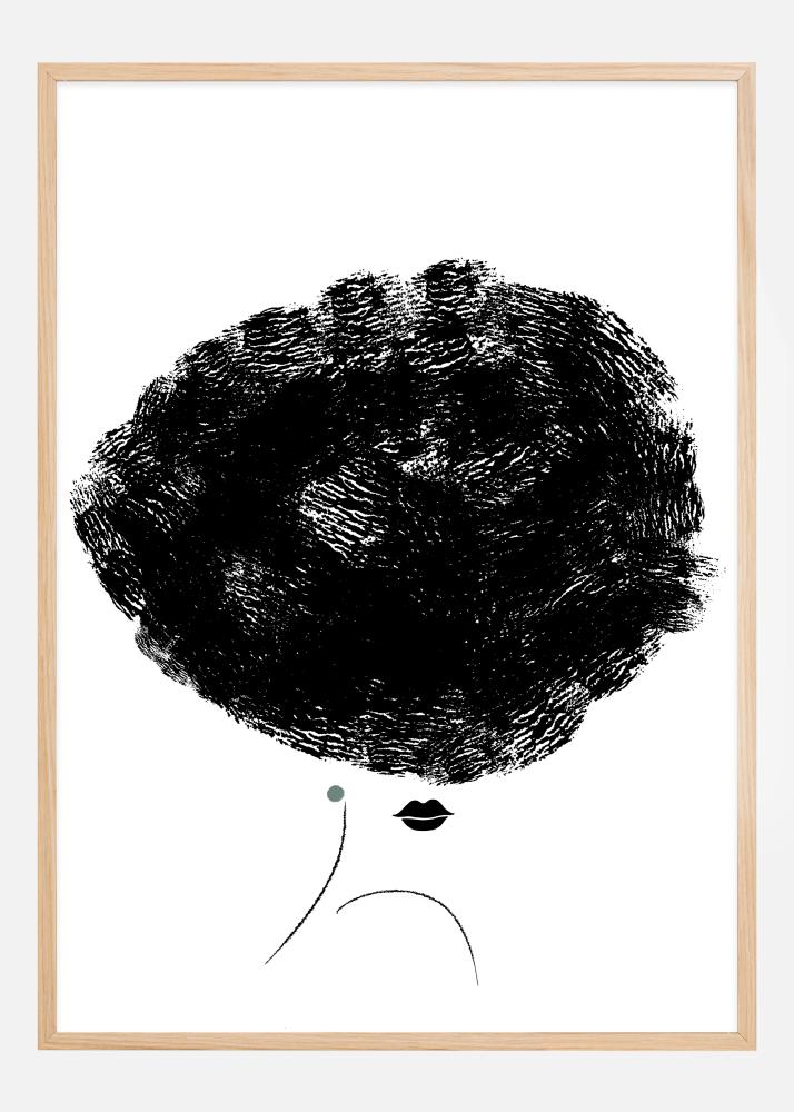 Dieses konzeptionelle Poster zeigt ein minimalistisches, aber ausdrucksstarkes weibliches Profil, bei dem ihr großes, voluminöses Haar die Szene dominiert. Das Haar, dargestellt mit kraftvollen und dicken Pinselstrichen in Schwarz, schafft einen dramatischen Kontrast zum weißen Hintergrund und vermittelt das Gefühl einer dynamischen Bewegung, die in einem ruhigen Moment eingefangen wird. Ein kleiner, dezenter grüner Punkt, der am Ohr platziert ist, durchbricht die Monochromatik und fügt einen subtilen Farbakzent hinzu. Dieser Druck hebt das Wesentliche in Form und Farbe hervor und bietet eine kühne, moderne Ästhetik für jeden zeitgenössischen Raum.