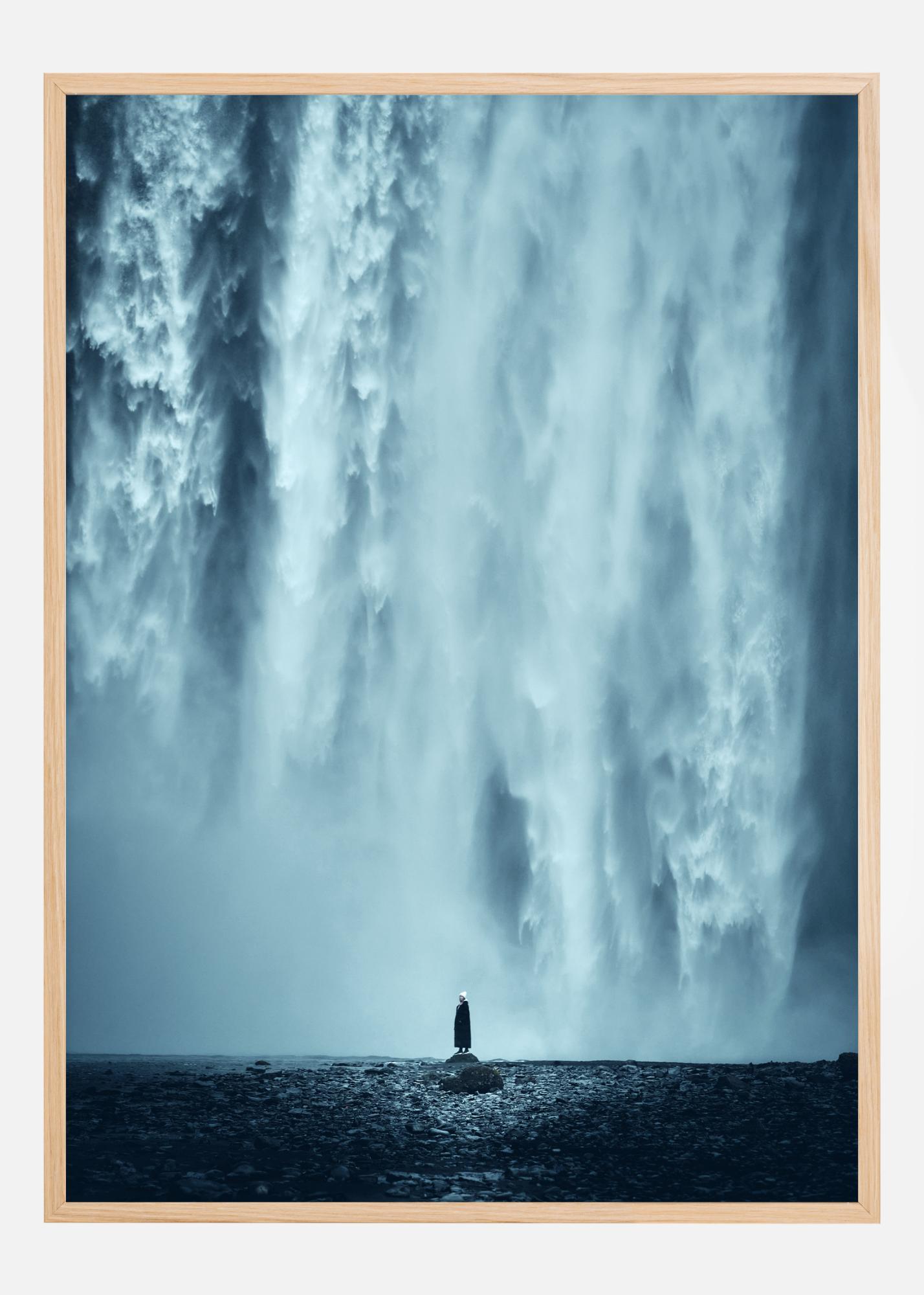 Ein episches Poster, das die atemberaubende Kraft der Natur zeigt, wenn ein Wasserfall herabstürzt. Dramatik pur: Eine kleine schwarze Figur in der Mitte des Bildes blickt auf das herabstürzende Wasser. Der blau-weiße Wasserfall erweckt ein Gefühl des Wunderns in dieser großartigen Aufnahme.