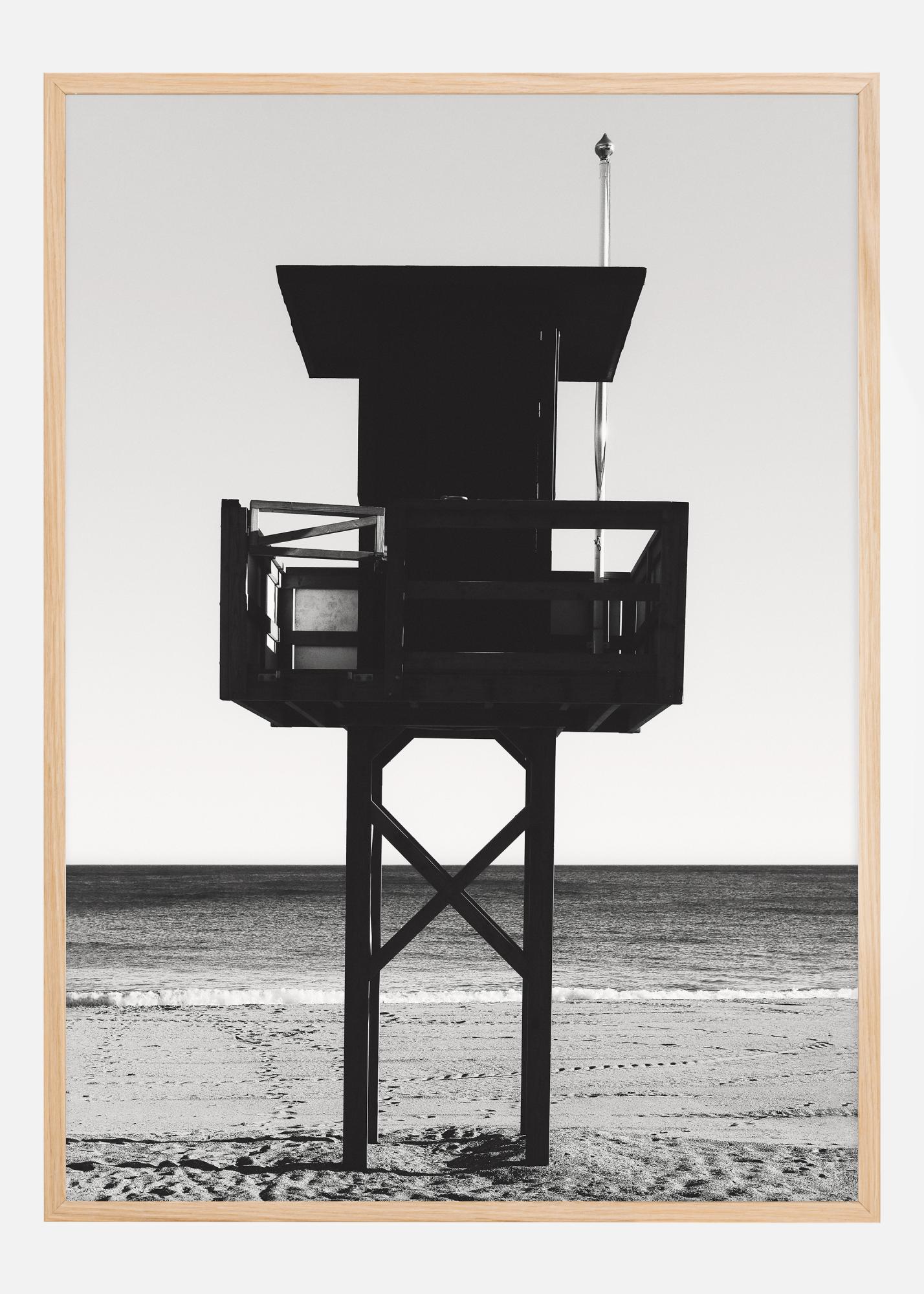 Dieses monochrome Poster zeigt eine ikonische Silhouette eines Strandwachturms vor einem klaren Himmel und einem ruhigen Meer. Der starke Kontrast zwischen dem dunklen Wachturm und den hellen Tönen von Sand und Himmel verleiht dem Bild eine grafische Qualität, die sowohl eindrucksvoll als auch zeitgemäß ist. Das Bild, das auf Augenhöhe aufgenommen wurde, schafft ein Gefühl von Präsenz und Ruhe, als ob man direkt am Strand steht und über das weite Meer blickt.