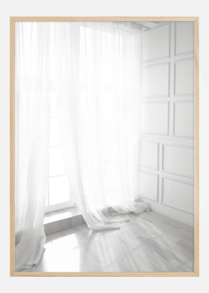 Dieses ruhige und reinigende Poster zeigt eine stille Ecke eines Raumes, drapiert mit durchscheinenden weißen Vorhängen. Das durch den Stoff gefilterte Licht erzeugt ein Spiel von Schatten und Nuancen auf dem glänzenden Boden, was ein Gefühl von Friedlichkeit und Klarheit vermittelt. Dieses minimalistische Druckwerk ist ein Ausdruck von Stille und würde perfekt in eine Umgebung passen, die nach Einfachheit und Ruhe strebt.
