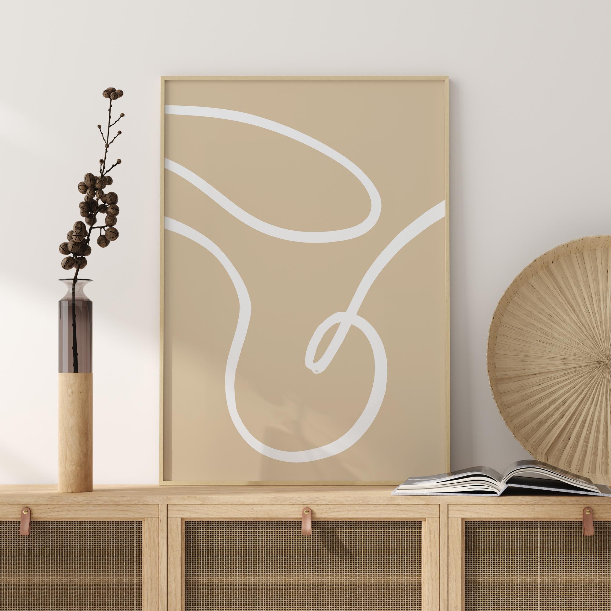 Ein einfaches Linienzeichnungsposter, bei dem sich die cremefarbenen Linien spiralförmig über den beigen Hintergrund ziehen, um Muster zu schaffen, die Ihre Fantasie anregen. Sehen Sie und stellen Sie sich vor, was immer Sie wollen, wenn Sie auf dieses Bild blicken. Setzen Sie es an einer Wand in einer kräftigen Farbe in Ihrem Zuhause in Szene.
