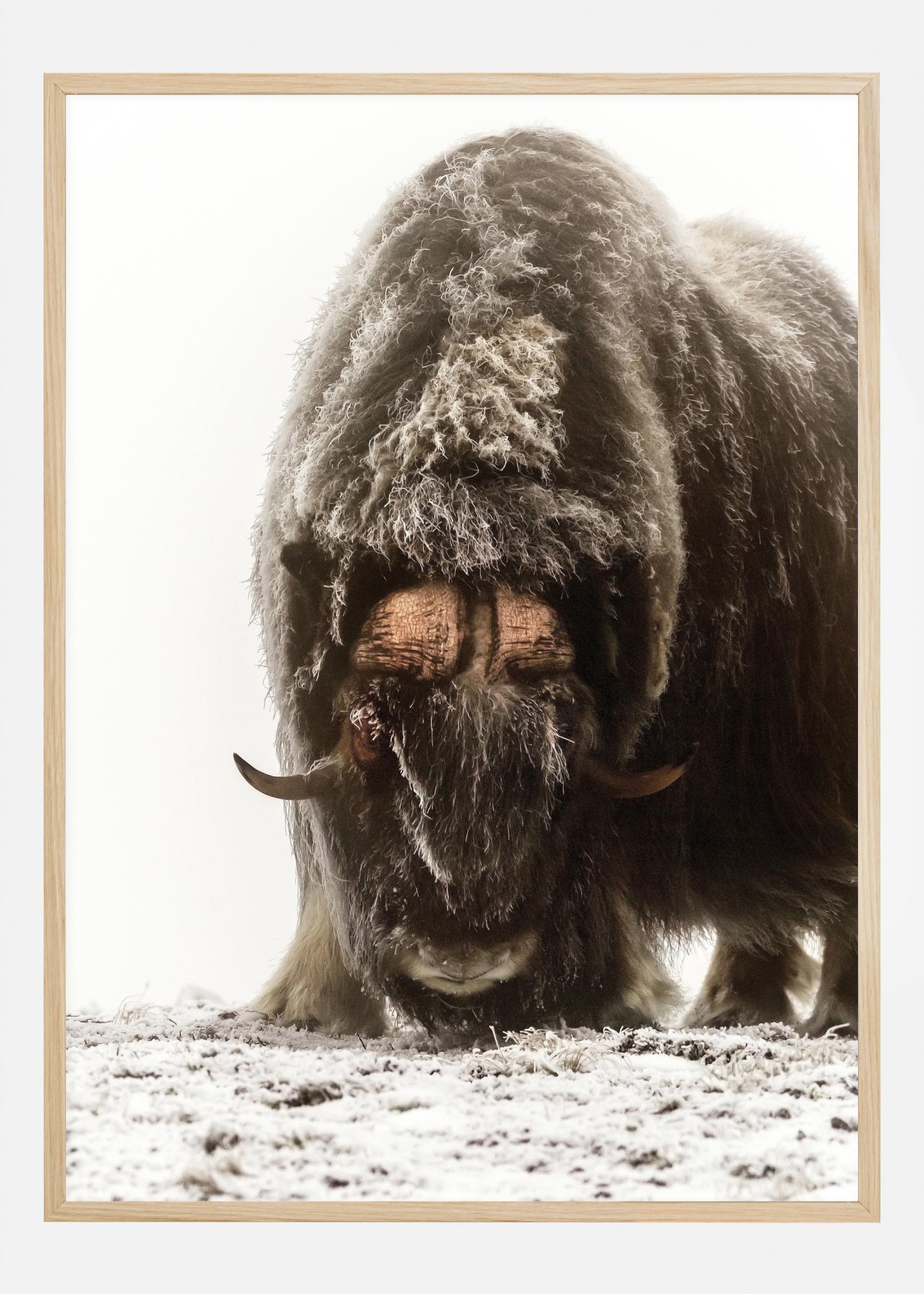 Ein Wildtierposter mit einem schneebedeckten Yak. Das lange braune Fell des Yaks sieht weich und üppig aus, während es auf der Suche nach Nahrung in die Kamera schaut. Der schneeweiße Hintergrund hebt es hervor und verleiht dem Bild Dramatik. Hängen Sie dieses Bild an Ihre Wand, um einen Hauch von Winter zu vermitteln.