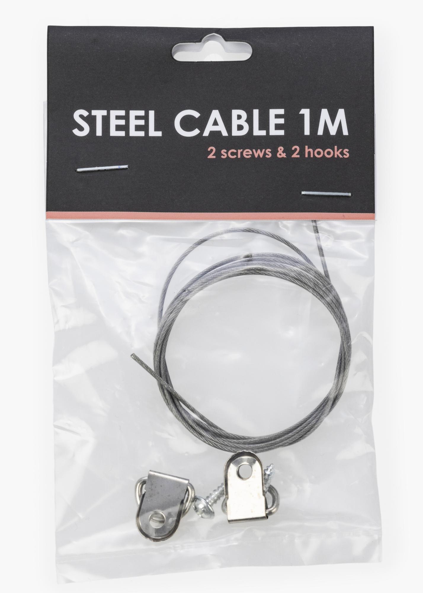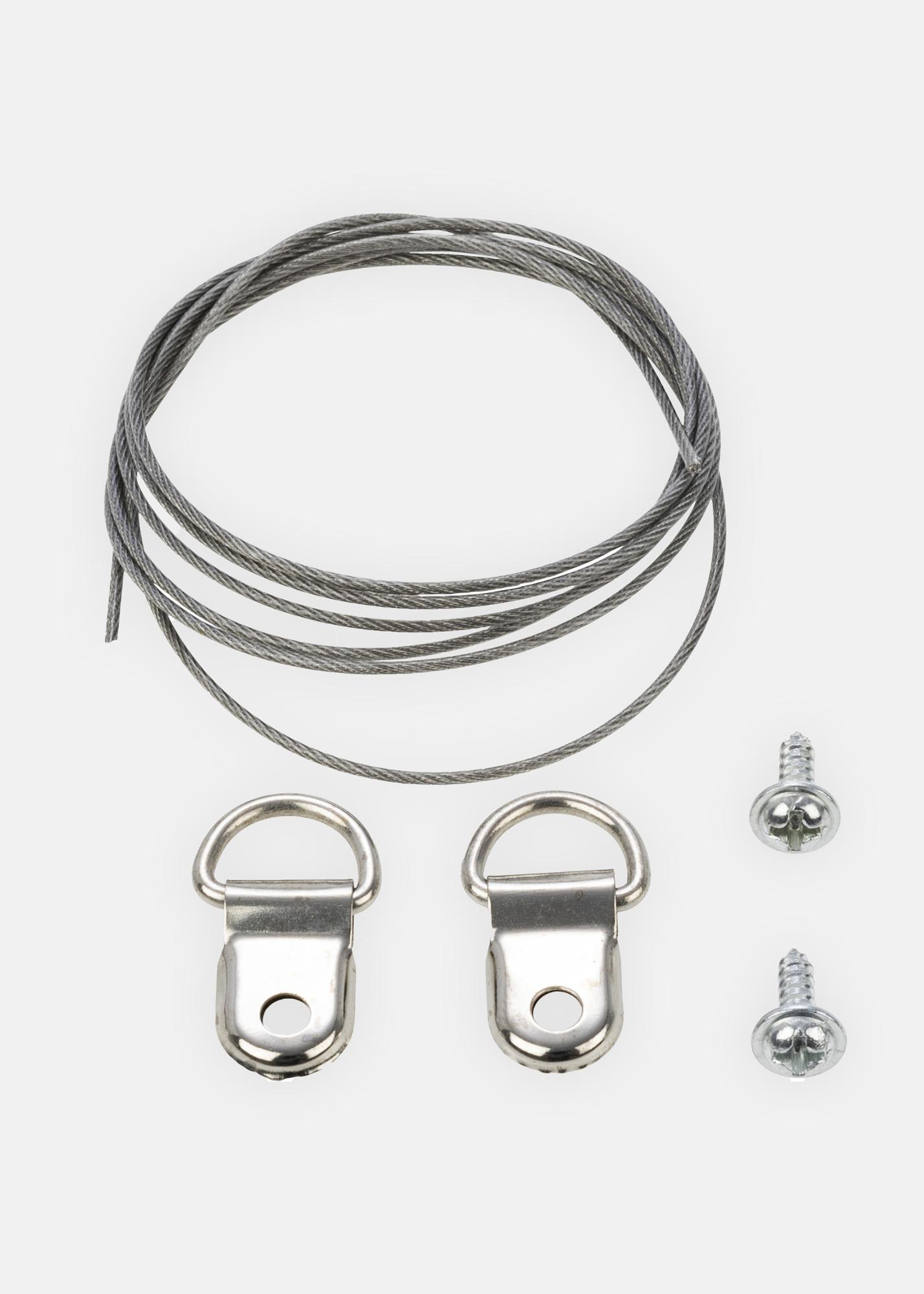 Mit diesem kompletten Kit zur Bildaufhängung bekommst du alles, was du zum Aufhängen deines Bildes mit Hilfe einer Seilaufhängung brauchst: Ein 1 m langes Stahlseil, 2 Schrauben und 2 Schlaufen/Haken. Das Stahlseil ist verzinkt, robust und dabei nur 0,7 mm dick, wodurch es sich einfach anwenden lässt, da es leicht formbar ist und nach Belieben gebogen und gedreht werden kann. Bitte beachten, dass diese Seilaufhängung nicht für jeden Bilderrahmen geeignet ist. Wir weisen darauf hin und raten davon ab, eine Stahlseilaufhängung für unsere Rahmen zu wählen, die bereits mit vormontierten Halterungen für die Wandaufhängung ausgestattet sind.