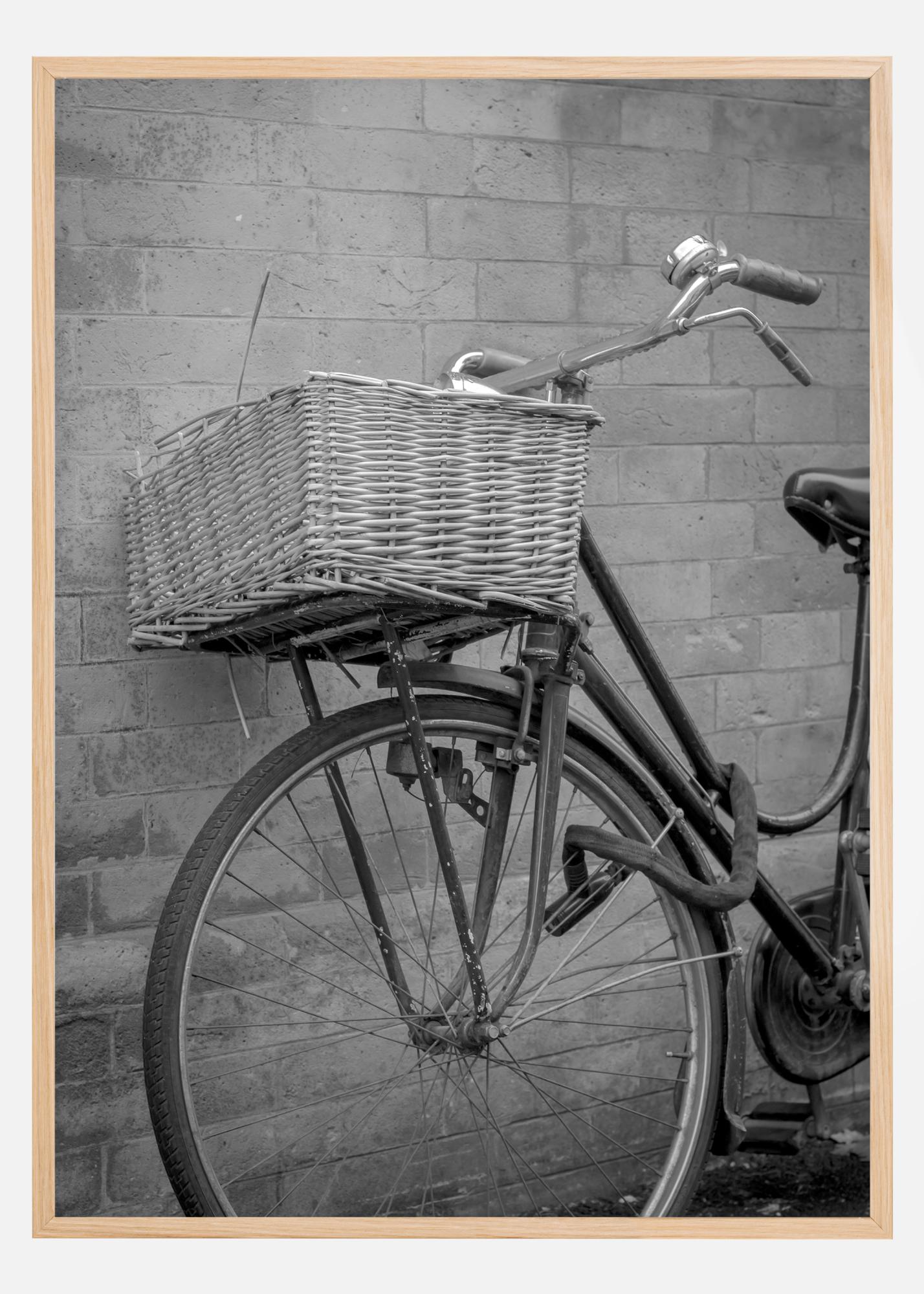 Ein Stillleben-Poster eines Fahrrads, das an einer Backsteinmauer lehnt. Der Weidenkorb des Fahrrads steht im Mittelpunkt, während es an der Wand lehnt. Der kräftige schwarze Rahmen und das Fahrradschloss führen das Auge um das Poster herum. Fügen Sie dieses schlichte Stück Eleganz zu einer hellen Wand hinzu, um einen geschmackvollen Look zu erzielen.