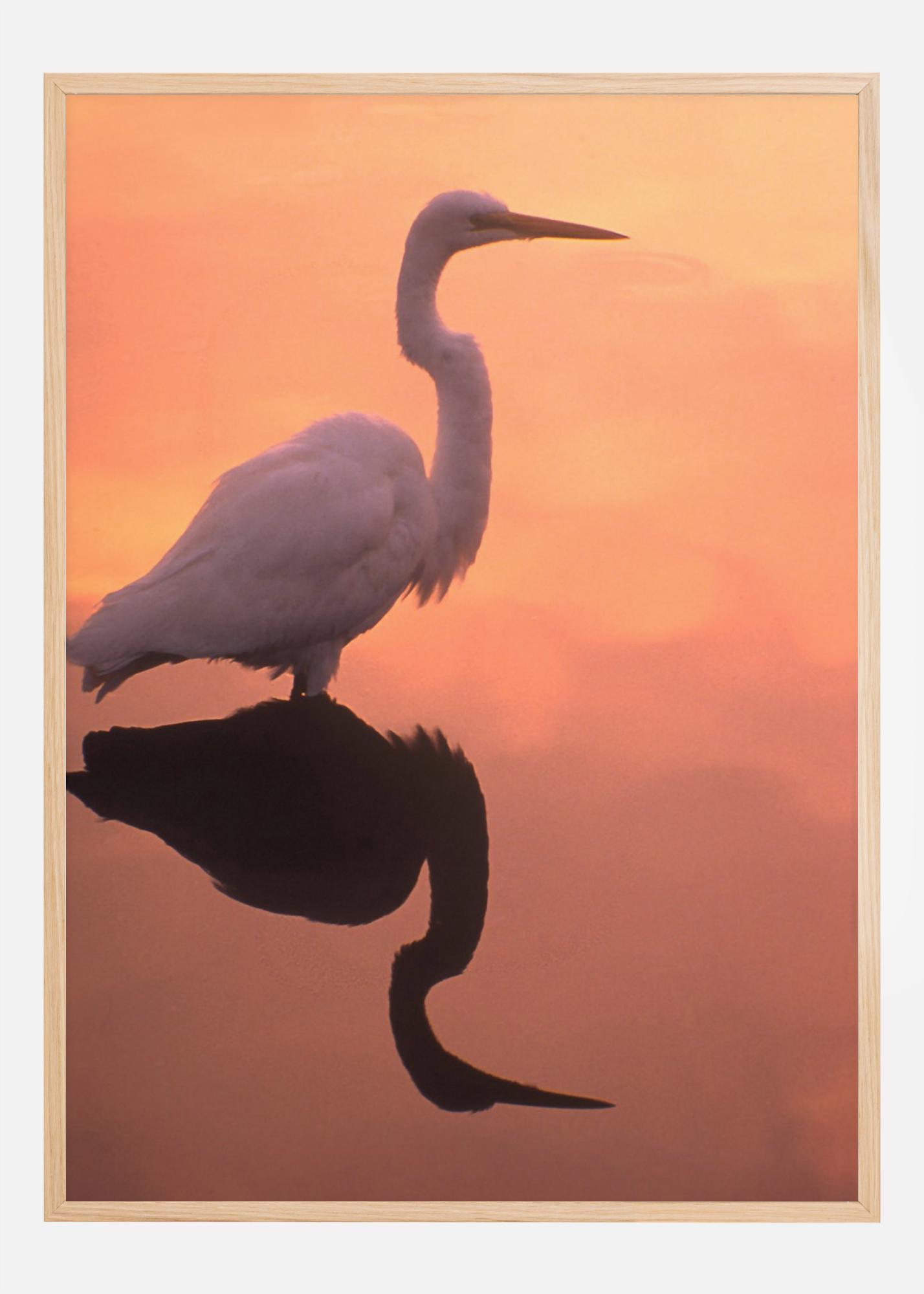 Ein Wildtierposter mit einem Weißstorch vor einem atemberaubenden orangefarbenen Himmel. In der einfachen Spiegelung des Storchs im Wasser spiegelt sich auch der Himmel perfekt wider. Die sanfte orange-gelbe Farbpalette ist der perfekte Weg, um Wärme und Ruhe in Ihr Zuhause zu bringen.