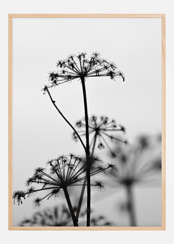 Ein einfaches Poster von Doldenblütlern vor einem weißen Hintergrund. Die schwarzen Silhouetten der Stängel und Samenköpfe dieser Doldenblütler kontrastieren mit dem schlichten weißen Hintergrund. Fügen Sie dieses faszinierende Stück einer farbigen Wand hinzu, um die Details dieser Blütenköpfe zu bewundern.