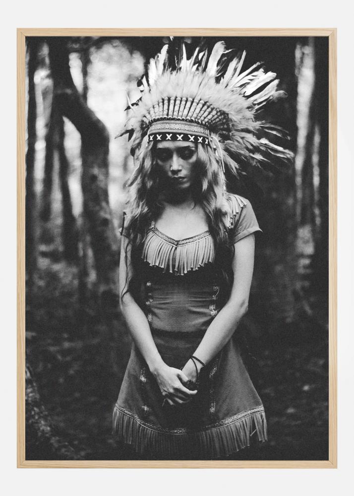 Ein Porträtposter mit einem indianischen Mädchen im Wald. In diesem starken Schwarz-Weiß-Bild heben sich die weißen Federn des Kopfschmucks von den dunklen Baumstämmen ab. Begleiten Sie sie in einer nachdenklichen Stimmung, während sie ihren Blick auf ihre gefalteten Hände senkt.