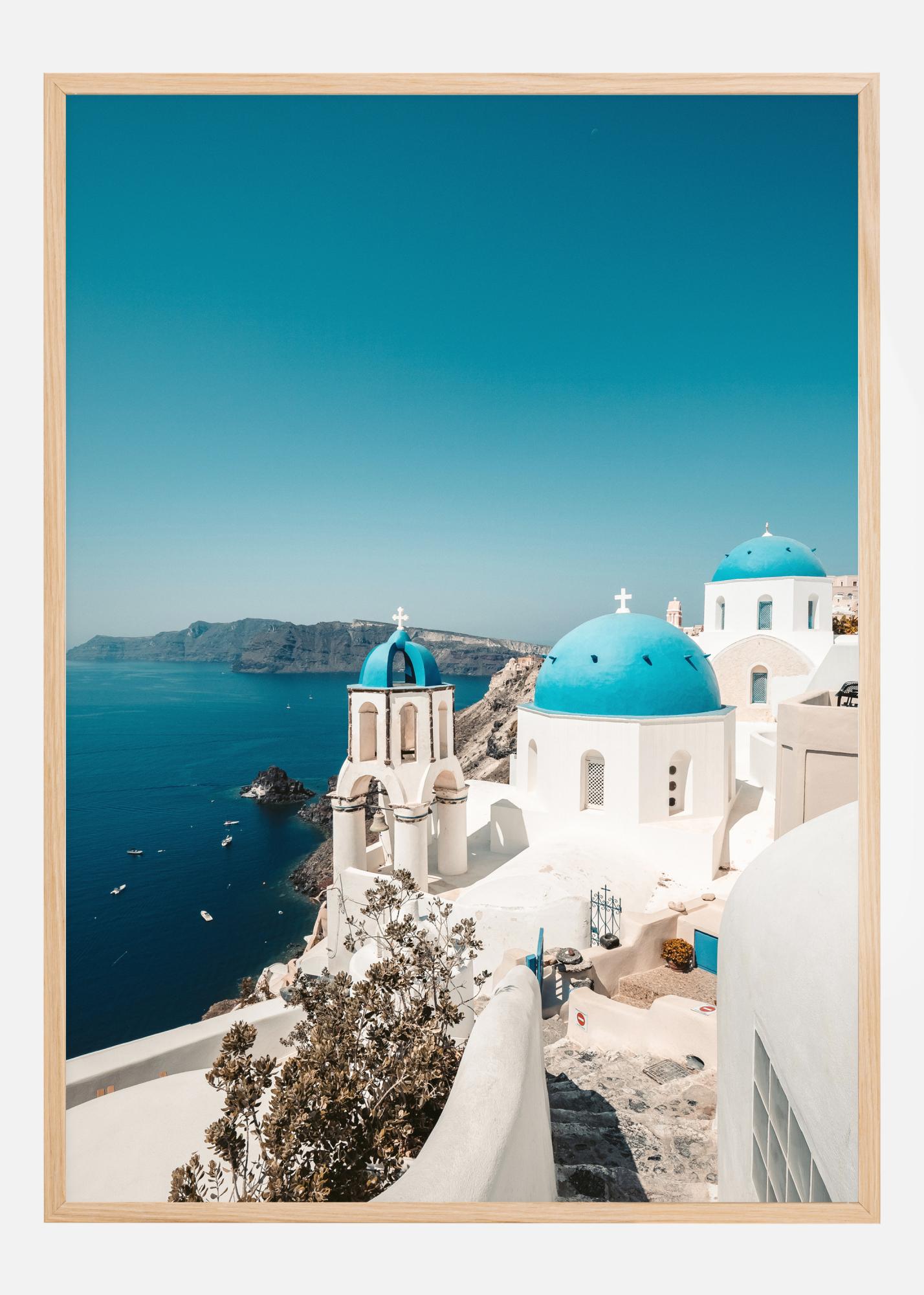 Ein helles Küstenposter einer kleinen griechischen Stadt am tiefblauen Meer. Alle Gebäude sind in einem strahlenden Weiß gehalten und werden von blauen Kuppeln gekrönt, die zum Blau des Meeres und des Himmels passen. Stellen Sie sich vor, es wäre Ihr Balkon und Ihr Fensterblick, wenn Sie dieses Poster zu Hause aufhängen.