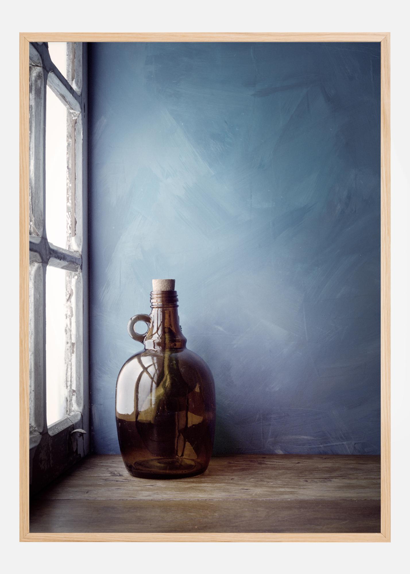 Ein Stillleben-Poster mit einer braunen Flasche vor einer blauen Wand. Das Licht aus einem Fenster scheint von links herein und beleuchtet die Flasche, die sich darin spiegelt. Die sanfte blaue Wand und der alte Holztisch, auf dem die Flasche steht, verleihen Ihrem Zuhause eine rustikale Atmosphäre.